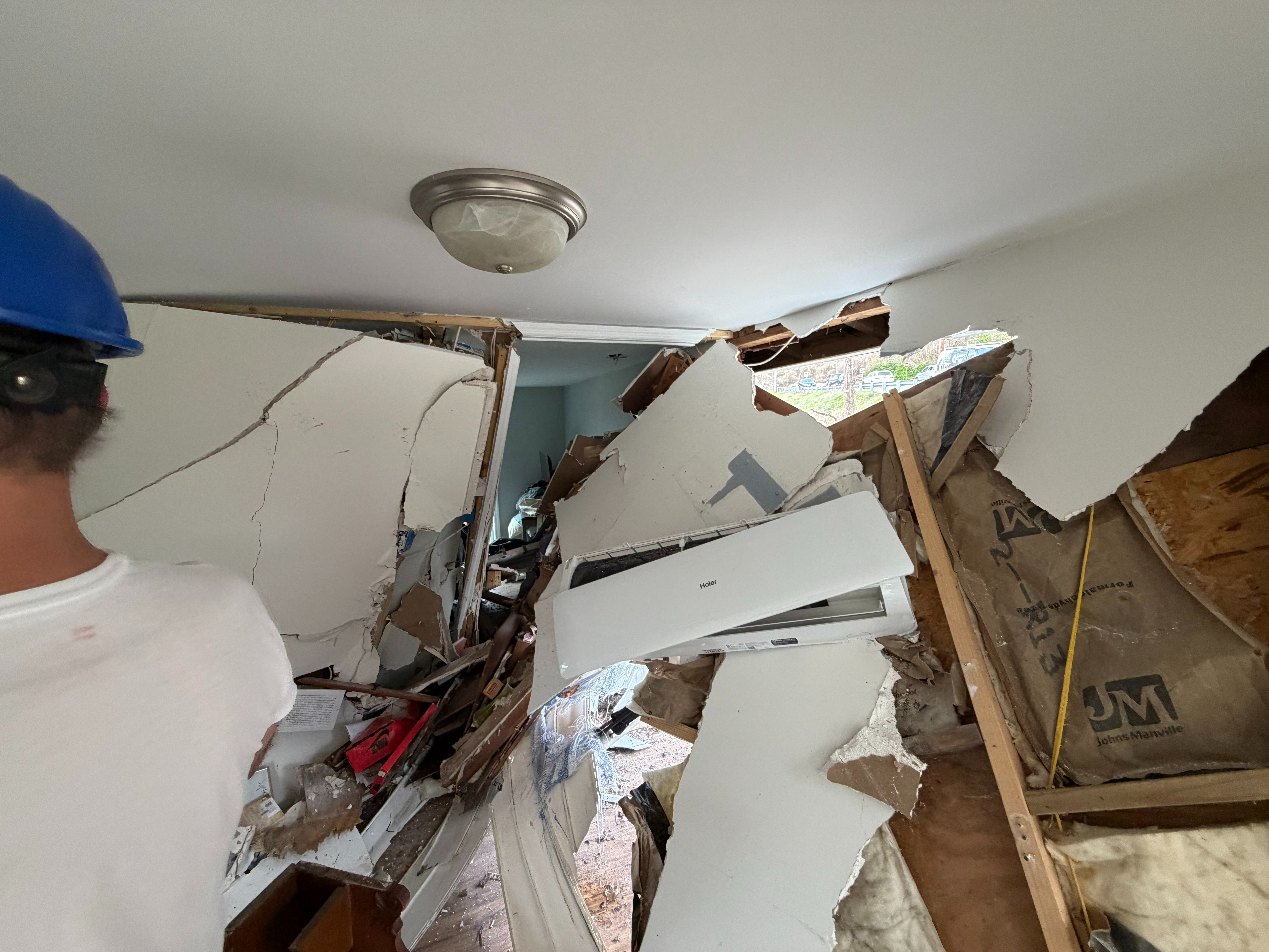 Police, firefighters, and ambulances had to respond to the scene. After the truck was pulled out of the house, it left a massive hole in the side of my living room. My belongings were scattered everywhere through the rubble. Books, clothing, food, and bedding were thrown around and damaged.