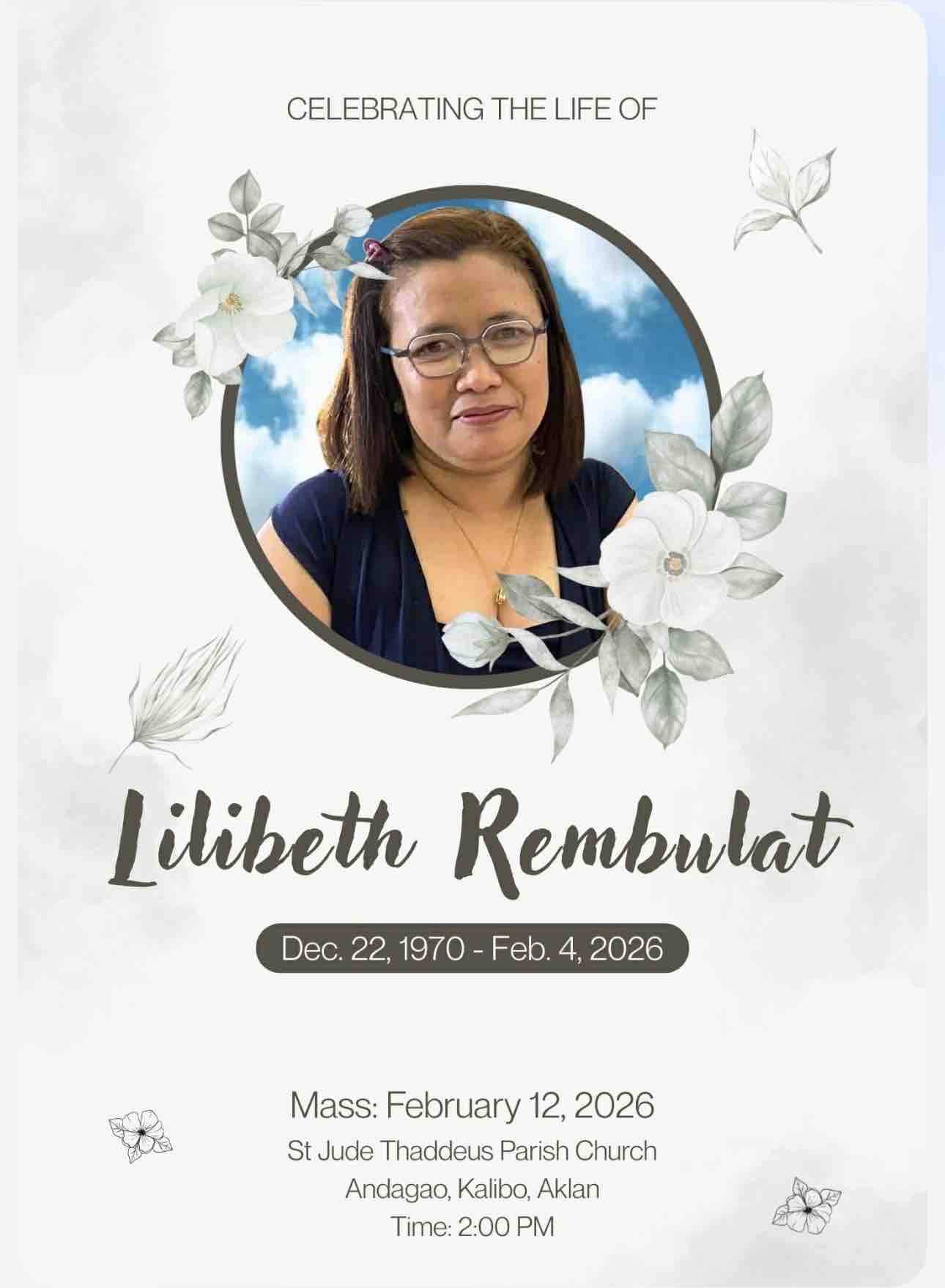 Hi, my name is Debbie Rembulat-Saturno, and I am fundraising for my sister-in-law, Lilibeth Oh Rembulat, who is currently in Kalibo, Aklan, Philippines.