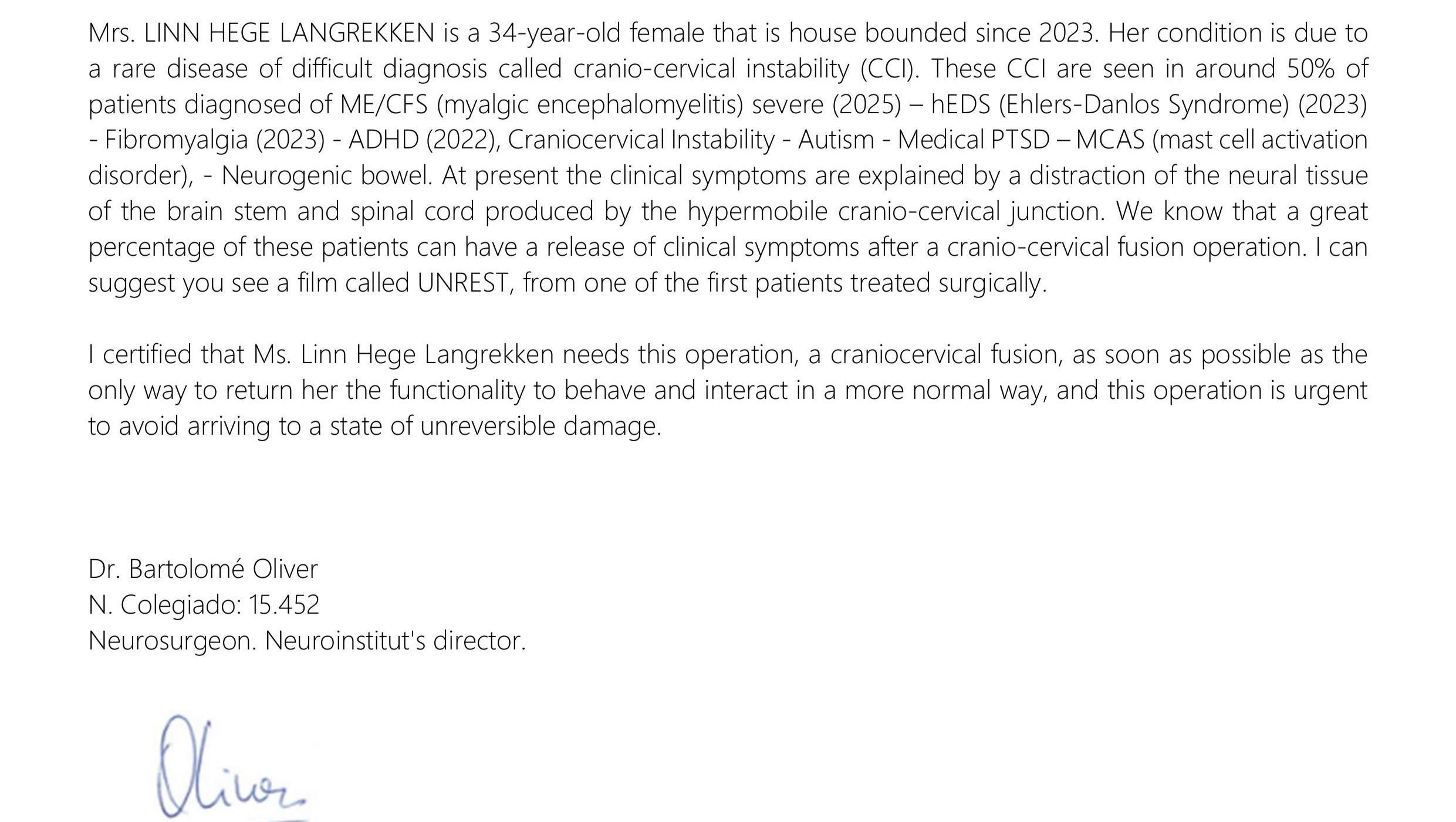 2) Medical proof from my neurosurgeon Dr. Oliver:
