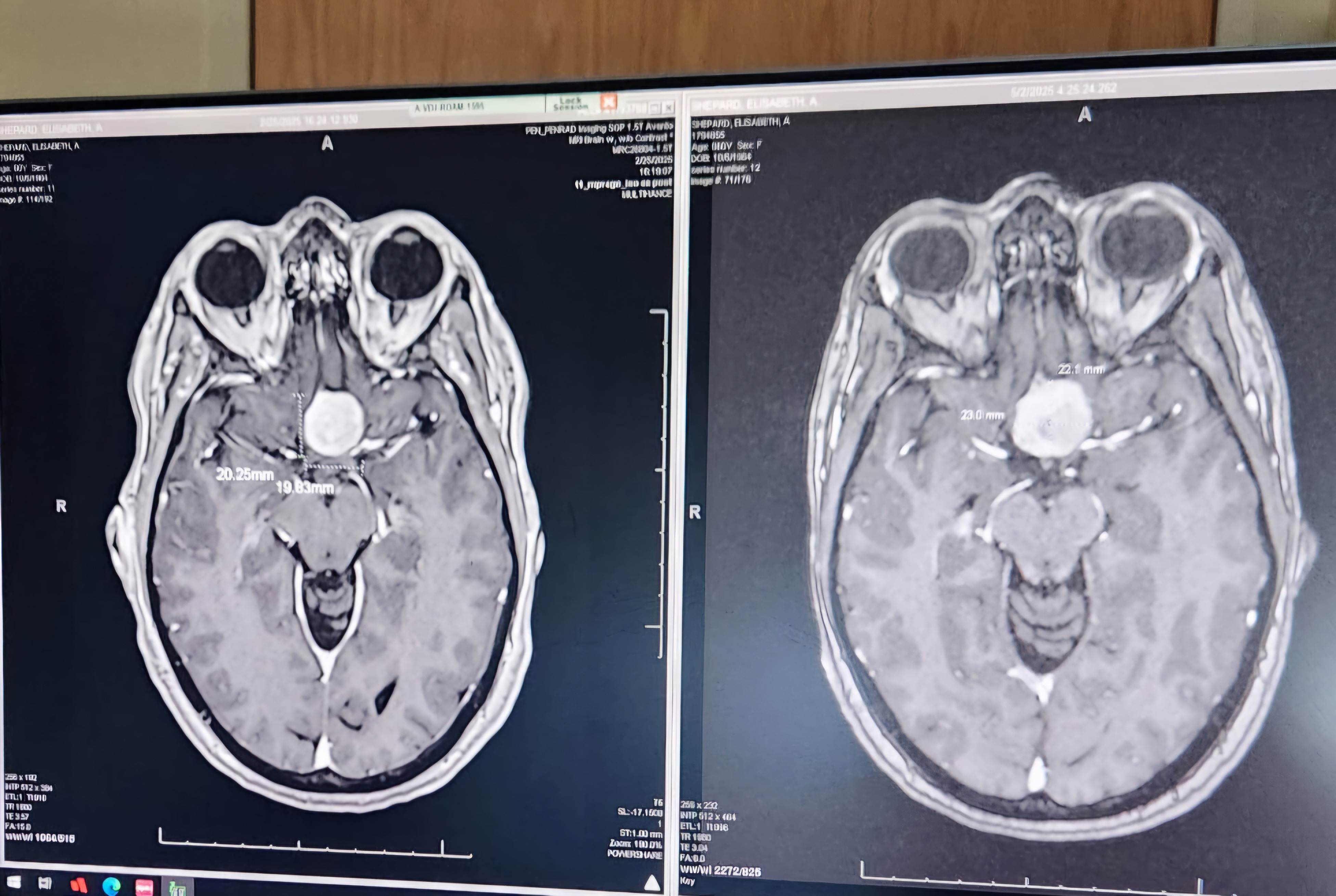 For those of you who don't know, Liz began experiencing vision difficulties at the end of 2023, steadily worsening until January 2025. The MRI on the left is from 2/2/25 and shows a 2cm by 2 cm mass compressing her optic nerve.