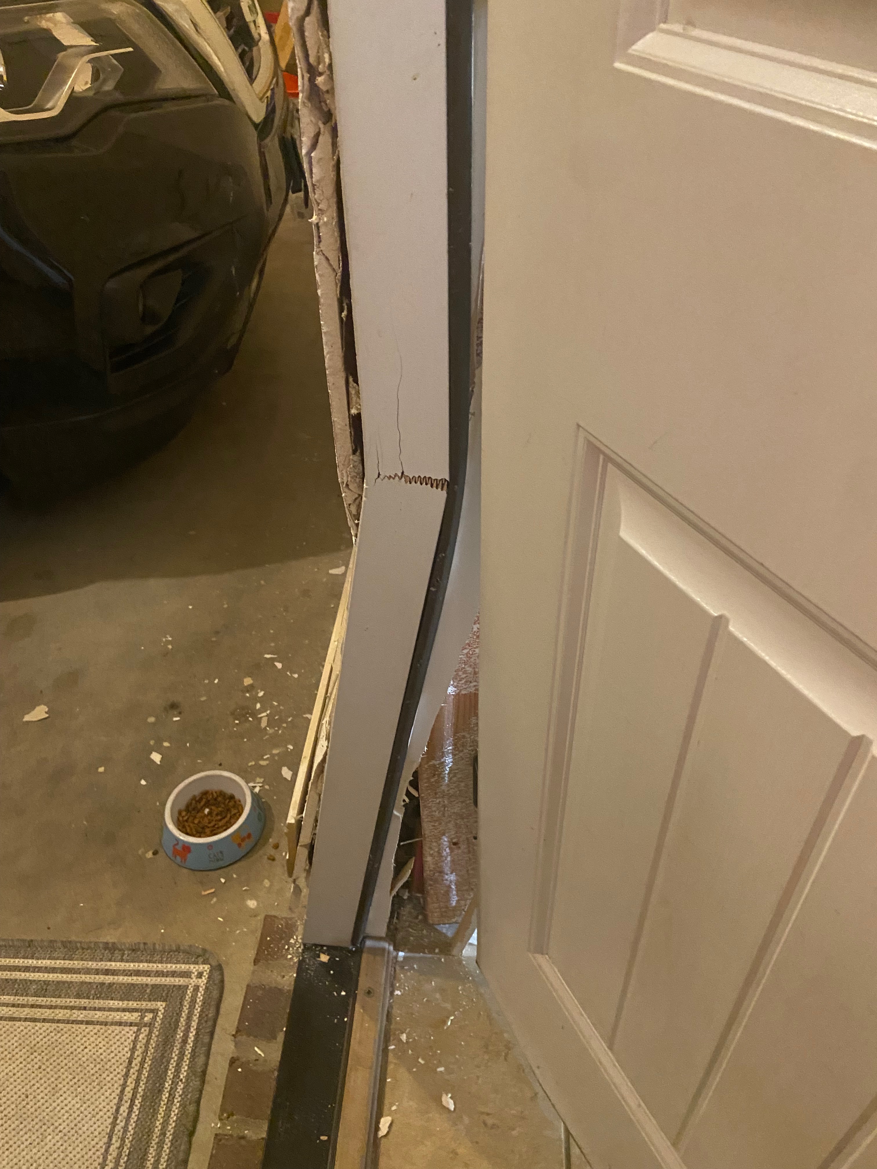 O impacto causou danos significativos entre a garagem e a lavanderia, quebrando paredes, acabamentos e o batente da porta, e deixando parte da nossa casa insegura para uso. Tivemos que interditar a área da lavanderia, e não conseguimos fechar completamente a porta entre a garagem e a casa, o que dificulta manter o lar seguro e bem isolado.
