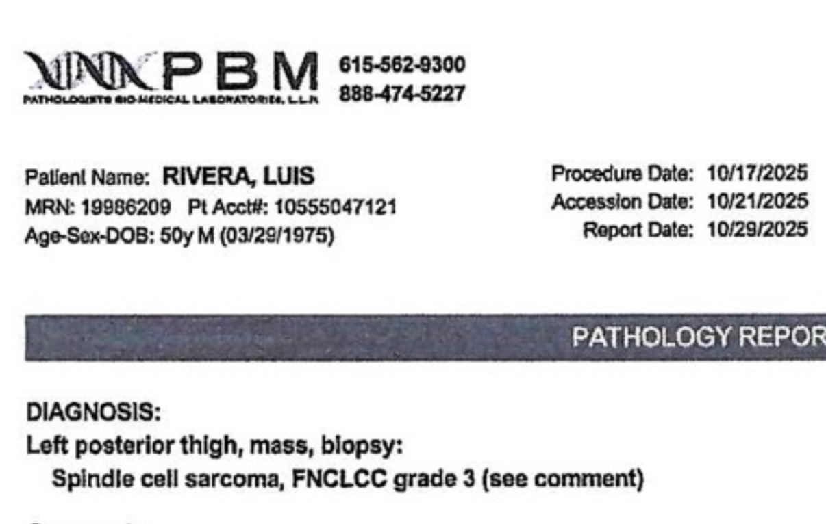 En octubre, Luis acudió a la sala de emergencias debido a un dolor severo en el muslo izquierdo. Después de varios estudios y biopsias, recibimos la devastadora noticia de que fue diagnosticado con un sarcoma grado 3 que se ha propagado a sus pulmones.