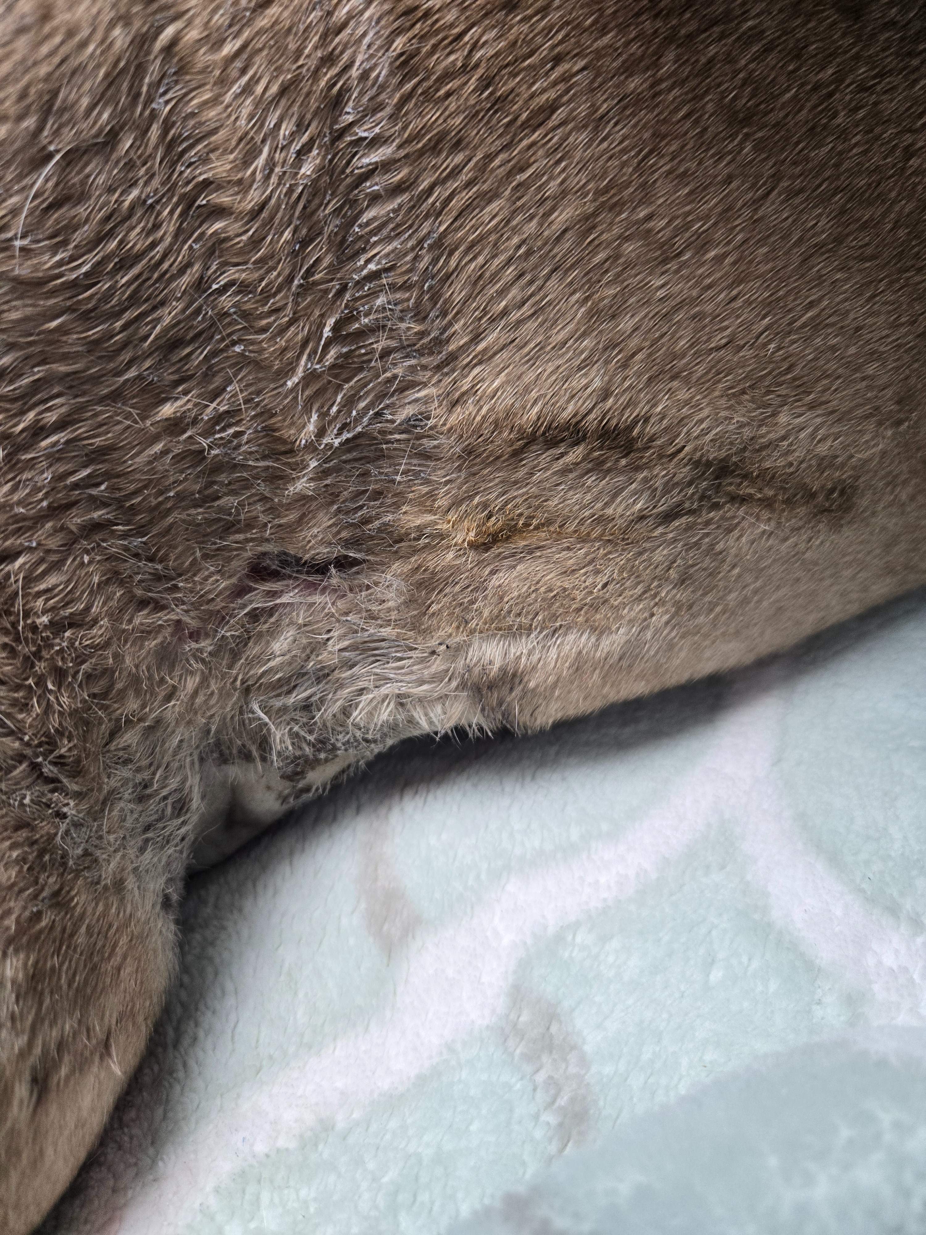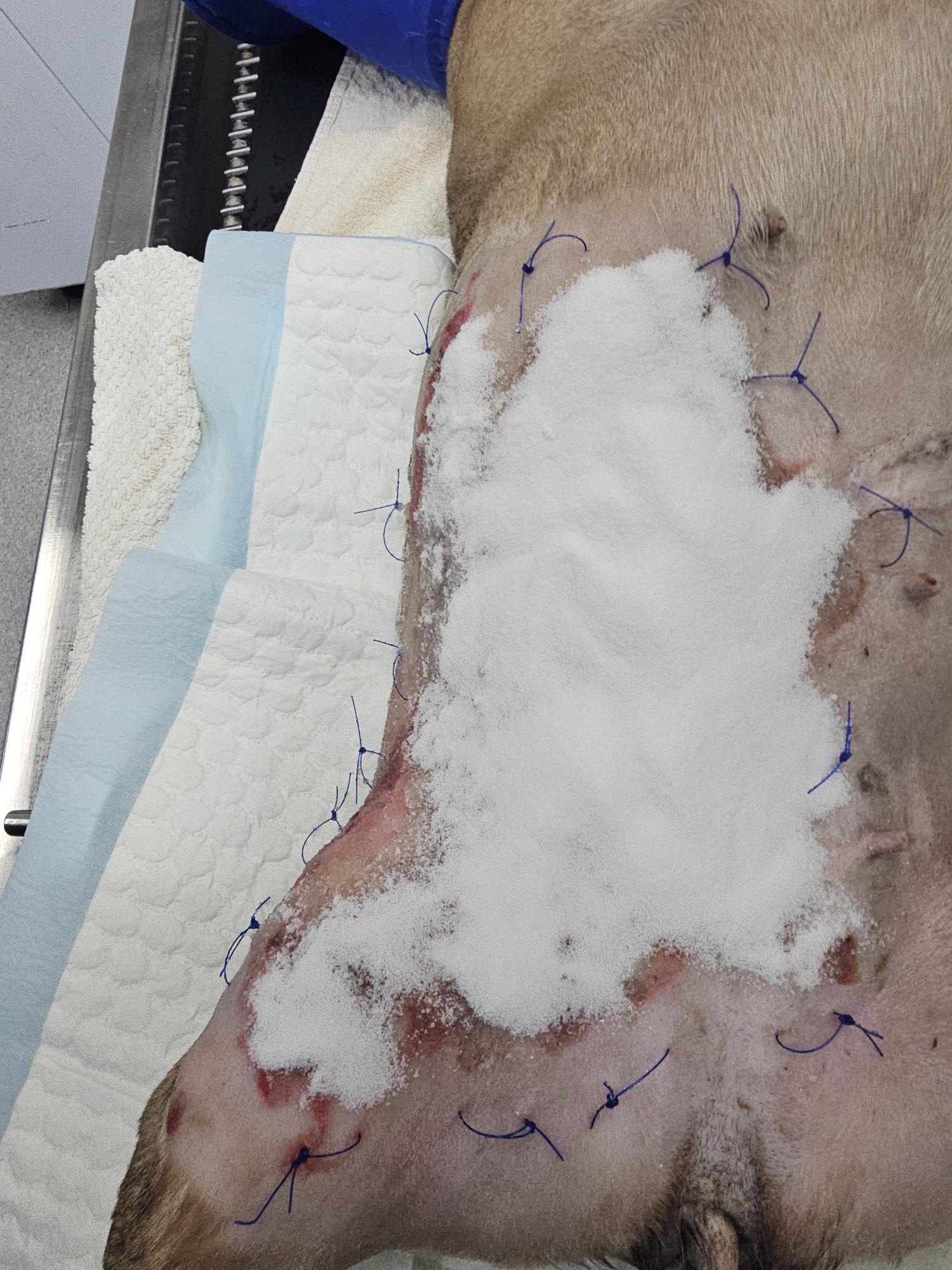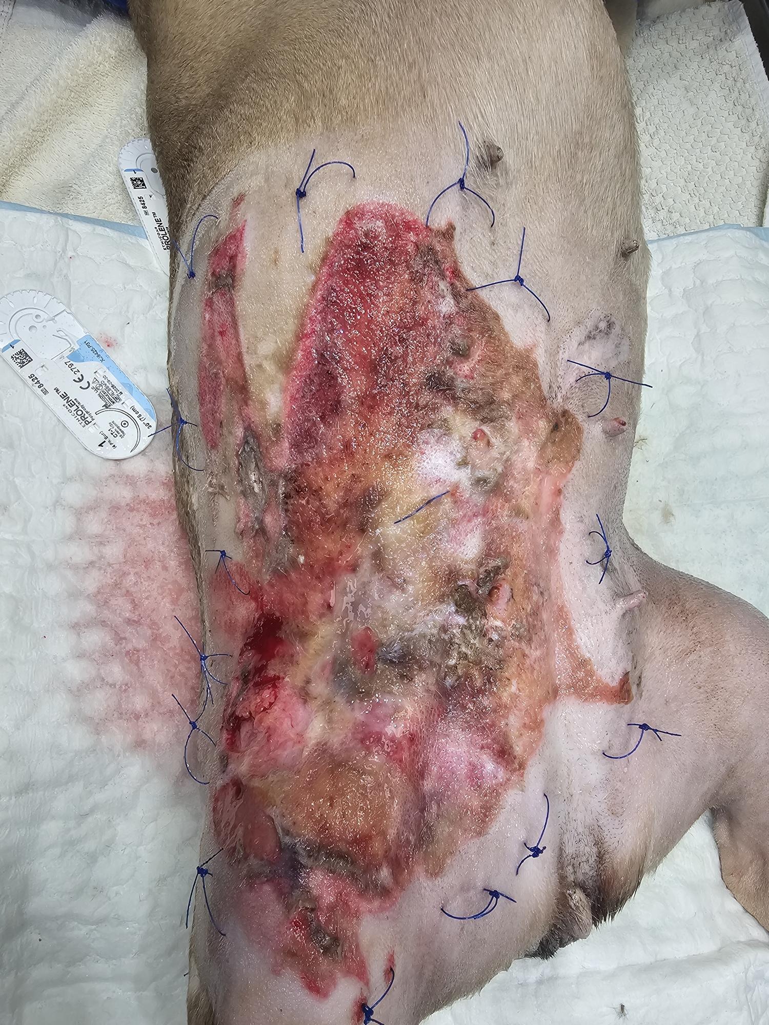 As if that weren’t enough, Luna has since developed a severe necrotic skin infection on her belly. It has worsened twice and has now spread to her stomach. She’s unable to keep any food down and is at serious risk of sepsis. Dr. Kim and the team at the ER are doing everything they can, keeping her wrapped in wet bandages and aggressively treating the infection to stabilize her.