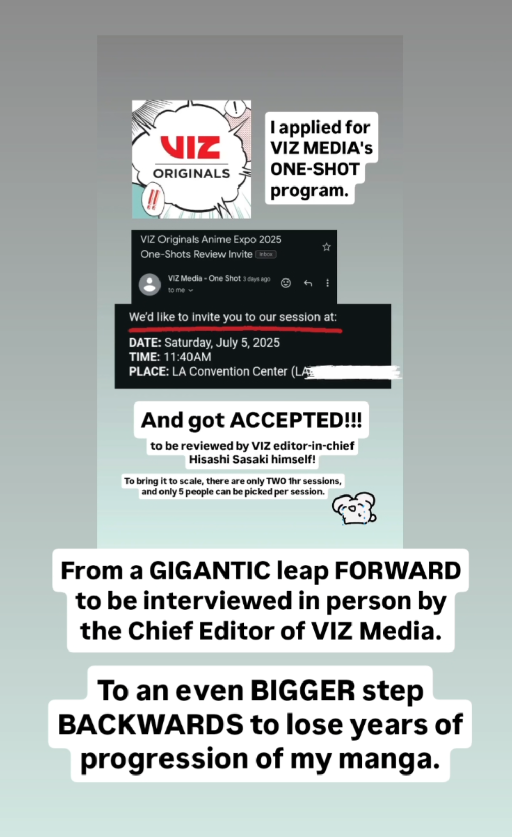 • Prior to this theft, I had the grand opportunity to meet with the editor-in-chief of VIZ media Hisashi Sasaki. I was selected 1 out of 10 lucky aspiring mangakas out of the entirety of Anime Expo. I had to take advantage and decided to bring EVERYTHING about my manga. From concept art to finished illustrations. From first drafts to my final written stories. While I have some back up in my google drive, it cannot replace the PSDs, misc. sketches, early works, and references I had in that drive.
