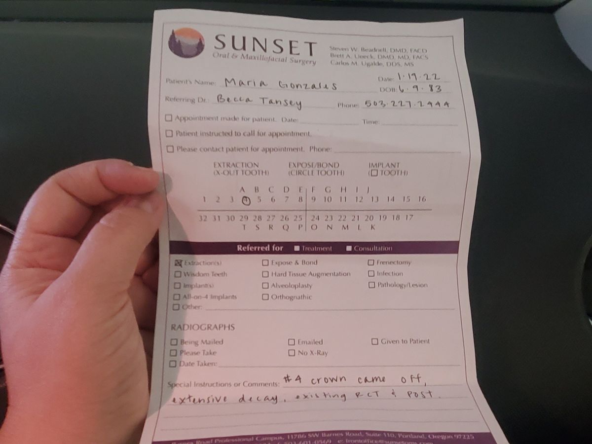 Hi everyone! My name is Maria Gonzales. A couple nights ago my crown fell out of my mouth. I went to the dentist today and they said I have extensive decay where the crown fell out, which means I will need to see an oral surgeon. The cost will be about $2200 just for the oral surgery. The partial (fake tooth) I will also need will be about $1000. Also a filling needs to be replaced that will be about $400. I paid $188 today just for my first visit.