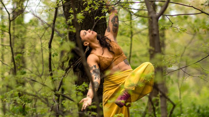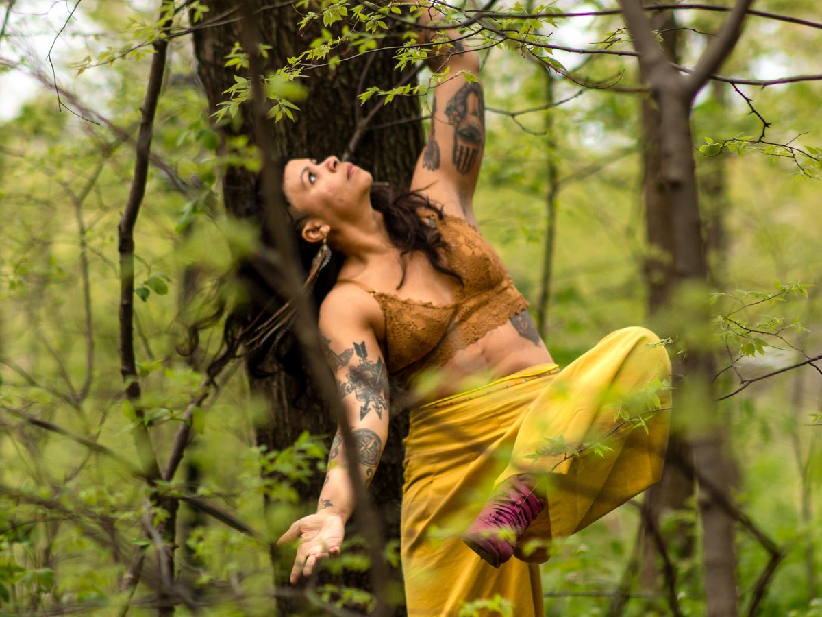 [Image Description: Marielys, an Afro-indigenous brown skin woman dancing in the woods wearing a lace sleeveless crop, loose pants, and sneakers. She balances one leg while the other is suspended in the air in front of her bent at the knee. The torso is slightly bent to the side, long hair cascading sideways, one hand reaching the Earth palm facing up, the other hand above her head palm down. Marielys looks at the open sky, dreaming of the impossible.]