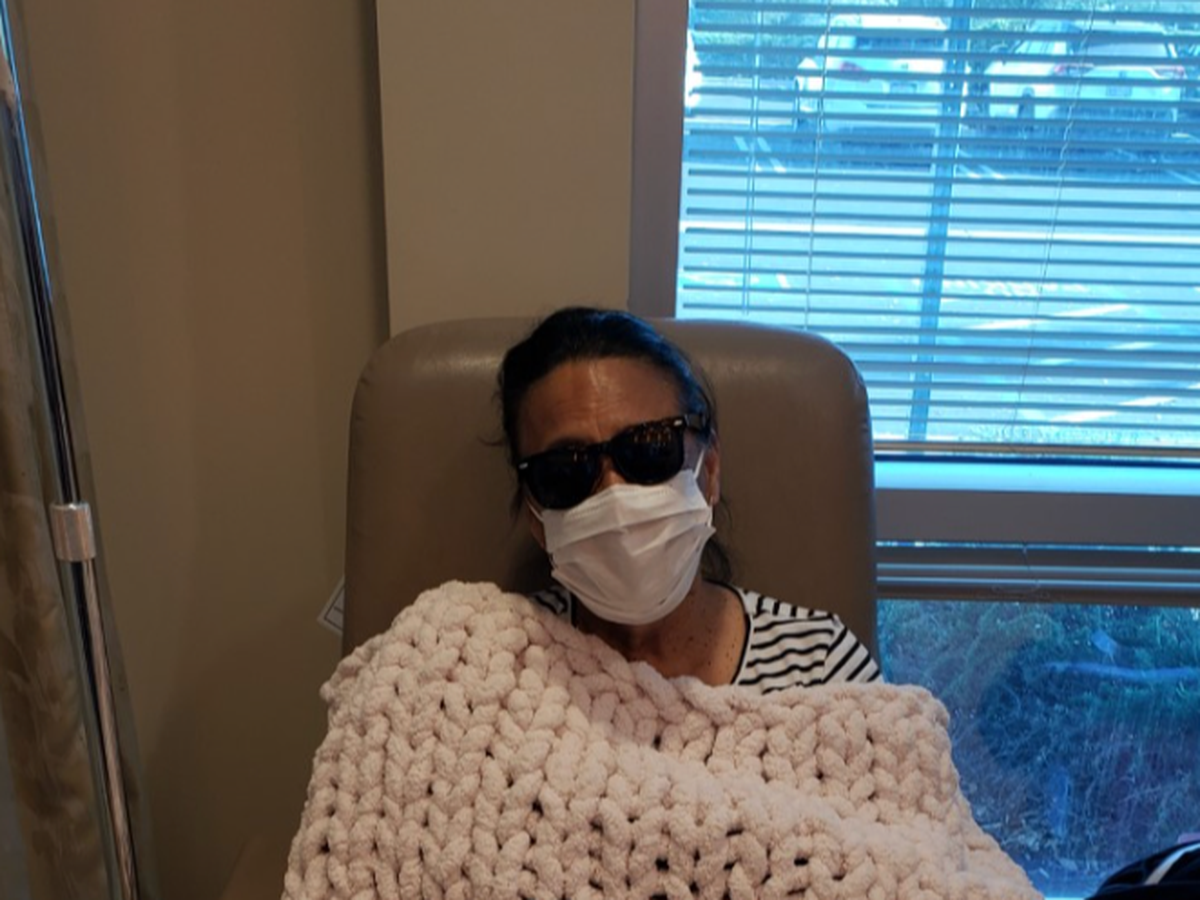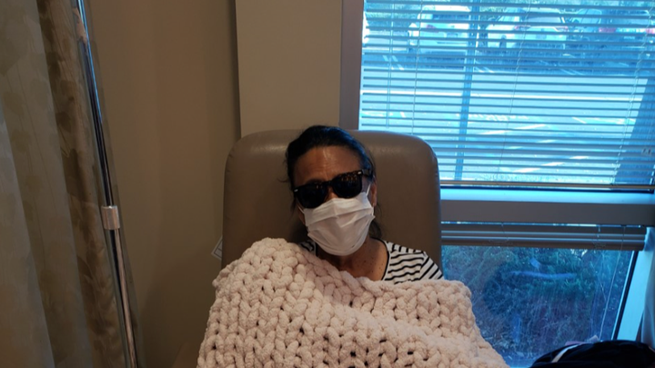 *The picture above was from her first Chemo Treatment, and her loving friend was kind enough to make a homemade blanket for her for comfort during the process.