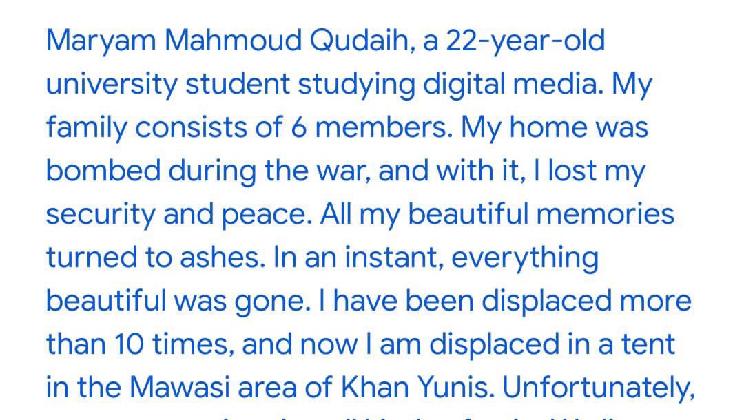 Hello my name is Maryam Mahmoud Qudaih, a 22 year old university student studying digital media. My family consists of 6 members. My home was bombed during the war, and with it, I lost my security and peace. All my beautiful memories turned to ashes. In an instant, everything beautiful was gone. I have been displaced more than 10 times, and now I am displaced in a tent in the Mawasi area of Khan Yunis. Unfortunately, we are experiencing all kinds of pain. We live under bombing, fear, hunger and humiliation. I hope you will support my campaign and help me provide the necessities of life for me and my family, so that I can complete my studies in light of the difficult circumstances we are living in. All my love to you all.