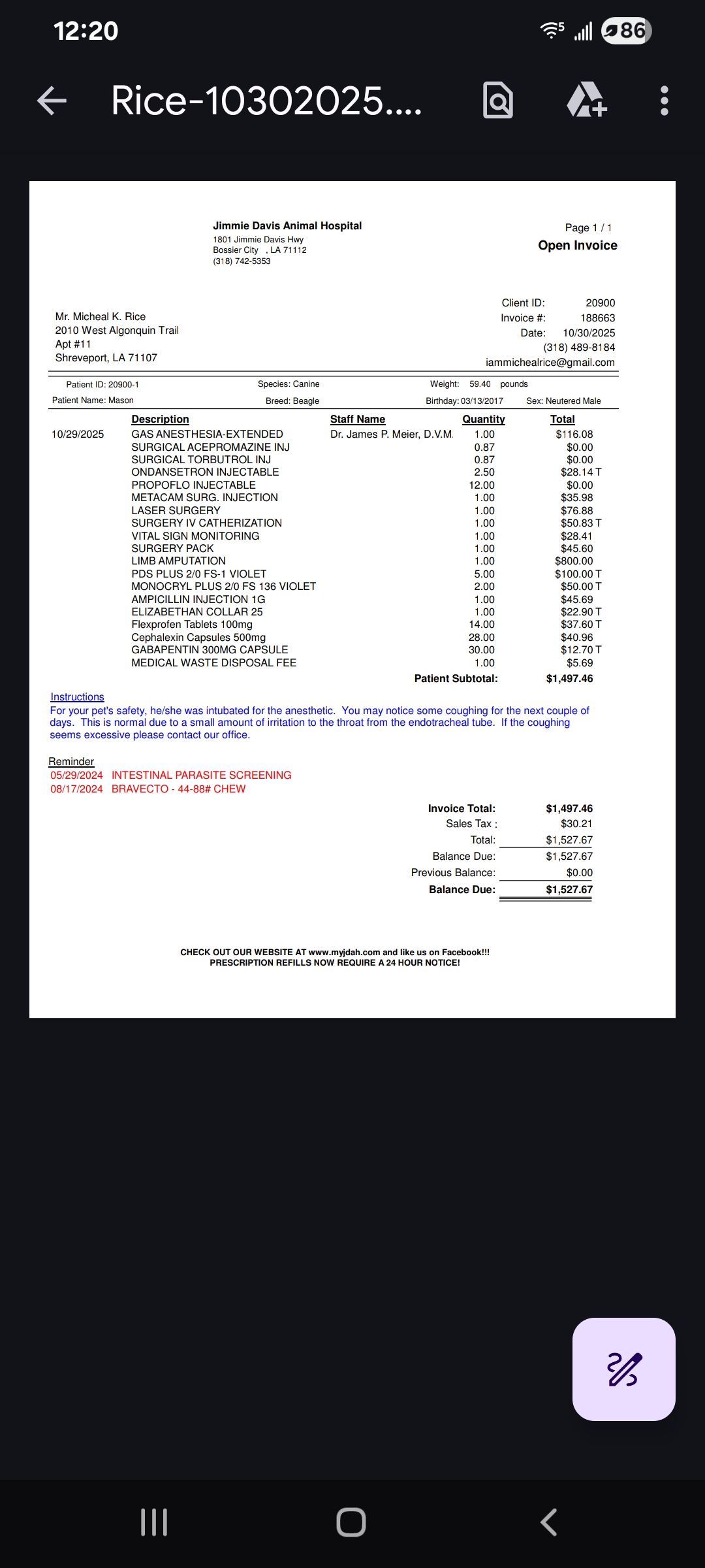 Hi this is Mason and he's been my emotional support animal for 8 years. What we thought was a torn ACL turned out to be a cancerous. mass. His leg has been doubling in growth and will need amputation. I am on disability and unfortunately do not have the funds to pay for the operation. I have posted his invoice for you to see. Thank you so much.