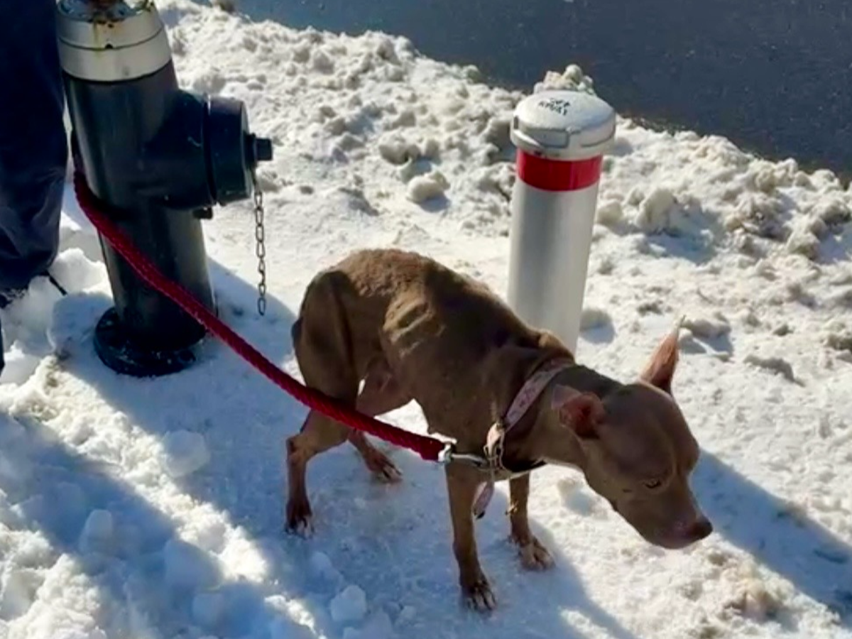 City workers were going about their day when they noticed something horrifying: a dog tied to a fire hydrant, trembling uncontrollably. She was painfully thin, shaking, and standing on pure ice. She kept lifting her paws, one after the other, trying to escape the freezing ground beneath her. Clearly she had been there for a long time.
