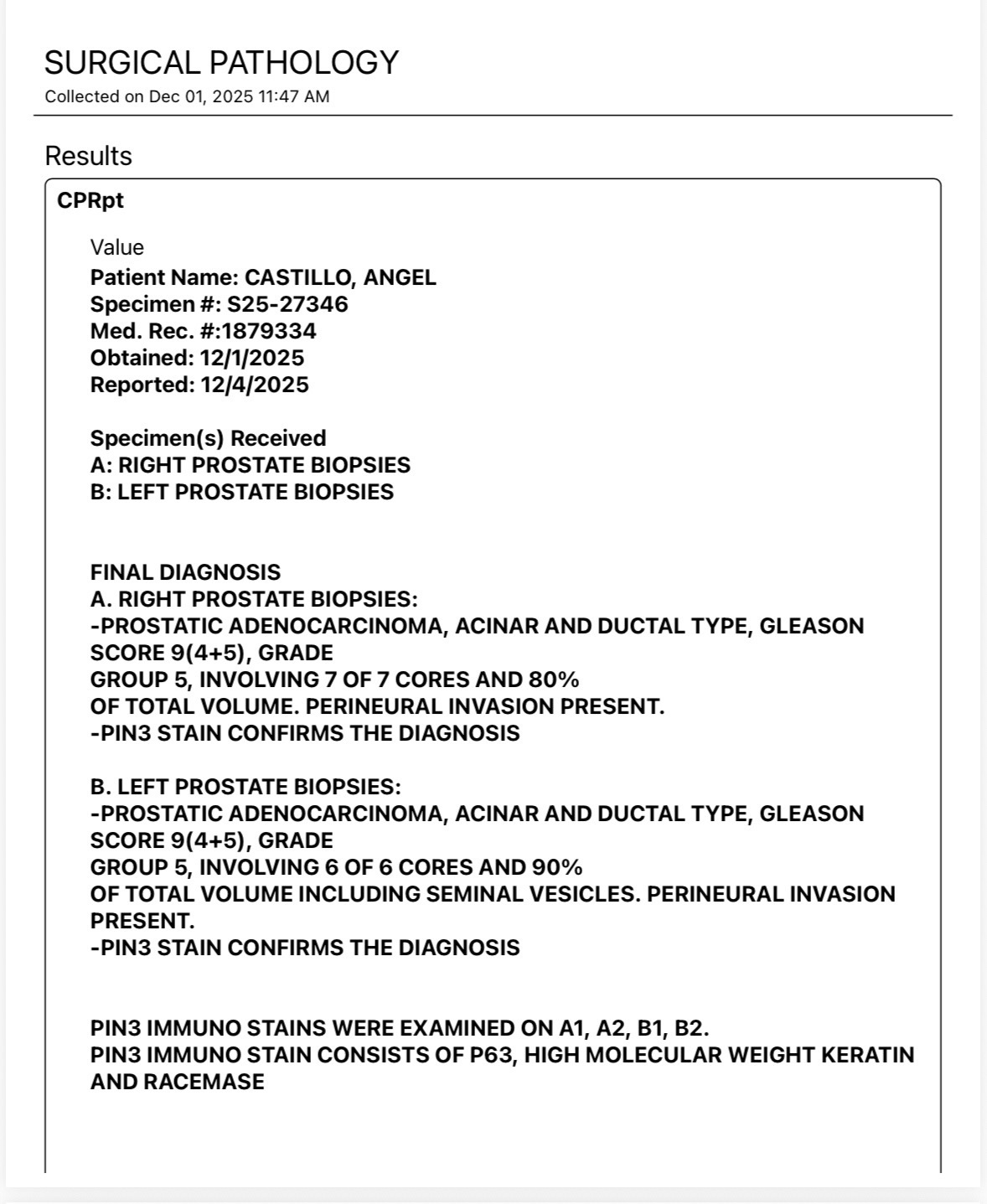 I have been diagnosed with aggressive prostate cancer (Gleason score 9, Grade 5) that requires immediate treatment. This has placed a significant burden, stress, and work limitations on my daily life. This all started last year with an annual checkup and needing to get a referral for my rheumatoid arthritis. To make matters worse, my PSA test results came back extremely high, leading to an MRI which showed PI-RADS 5 and 4 nodules. A biopsy confirmed prostate adenocarcinoma.