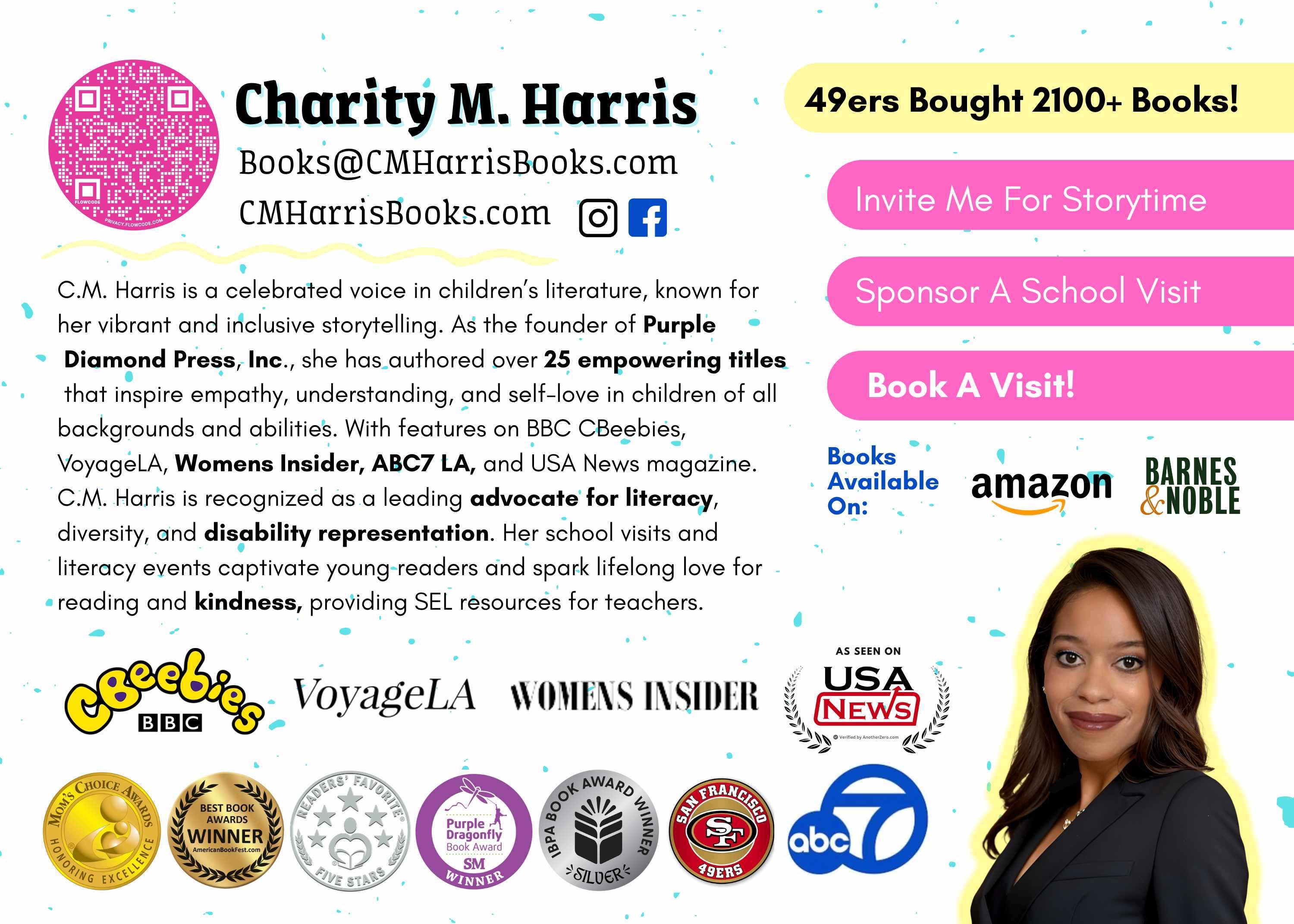 My name is Charity M. Harris, an award-winning children’s author, publisher, and disability advocate. I built my own publishing company from scratch to bring diverse, empowering stories to children everywhere. Living with a neuromuscular disability, Charcot Marie Tooth Disease, hasn’t been easy, especially after getting Covid for a third time, almost losing my life the first time, but I’ve dedicated my life to teaching kids kindness and resilience through literature.