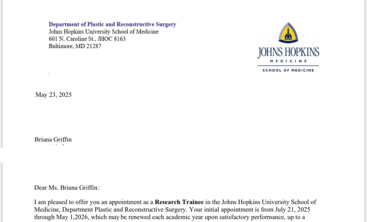 This summer, I was honored with an opportunity to join the Department of Plastic and Reconstructive Surgery at Johns Hopkins as a Research Trainee. This is a competitive, career-defining role—one that will allow me to collaborate on projects with leading plastic surgeons on impactful projects in burn reconstruction, upper extremity surgery, peripheral nerve repair, and more. Johns Hopkins is one of the top institutions in the country for both research and plastic surgery innovation, and this experience will allow me to gain invaluable skills while contributing to work that shapes the future of patient care.