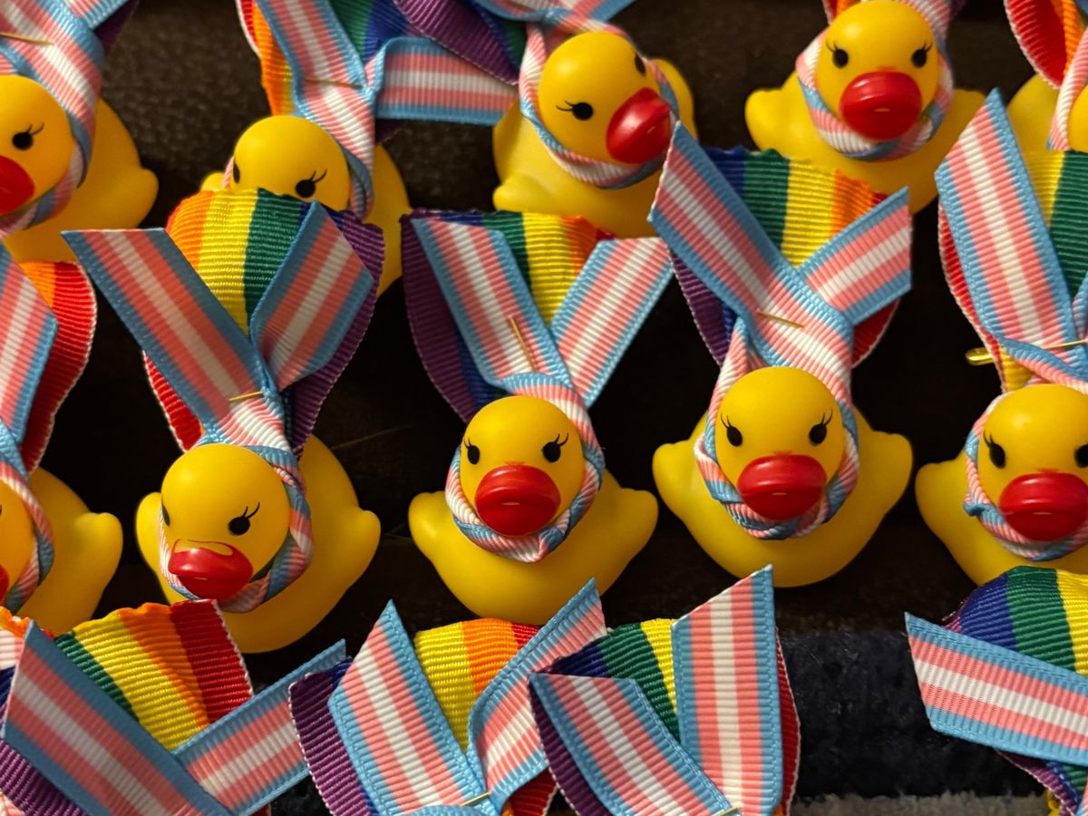I'm the Rainbow Duck Lady, and I give away free mini rubber ducks with pride capes and trans pride scarves. I also give away mini 3D ducks, stickers, and earplugs. I attend pride events throughout the year and give these away as a reminder to try our best to let hate-filled words from hate-filled people roll off like water off a duck's back. My ducks aren't magic, though; they're just little reminders to not let hate soak into who we are.