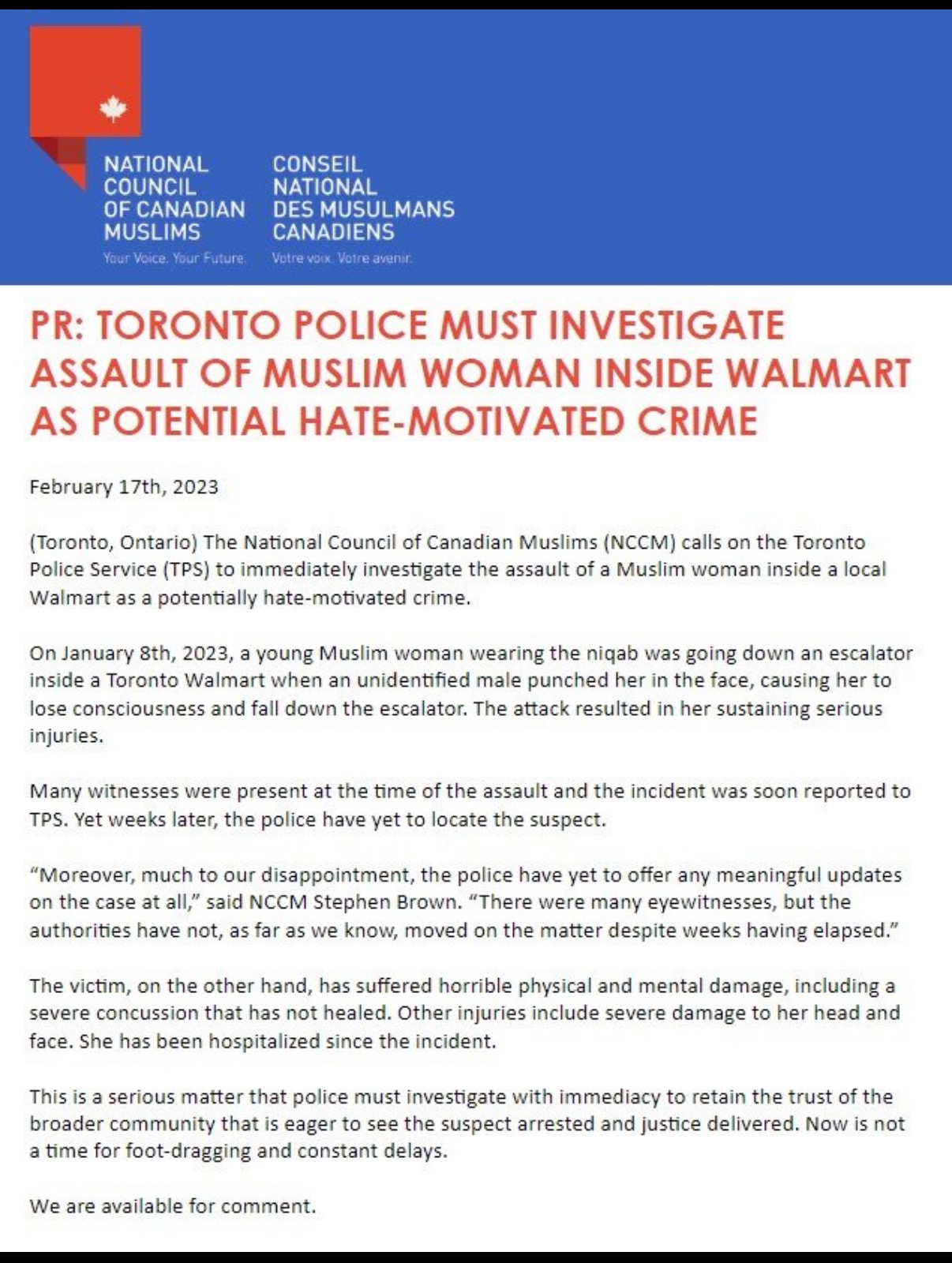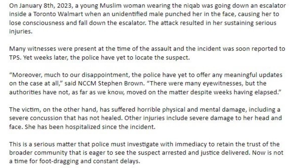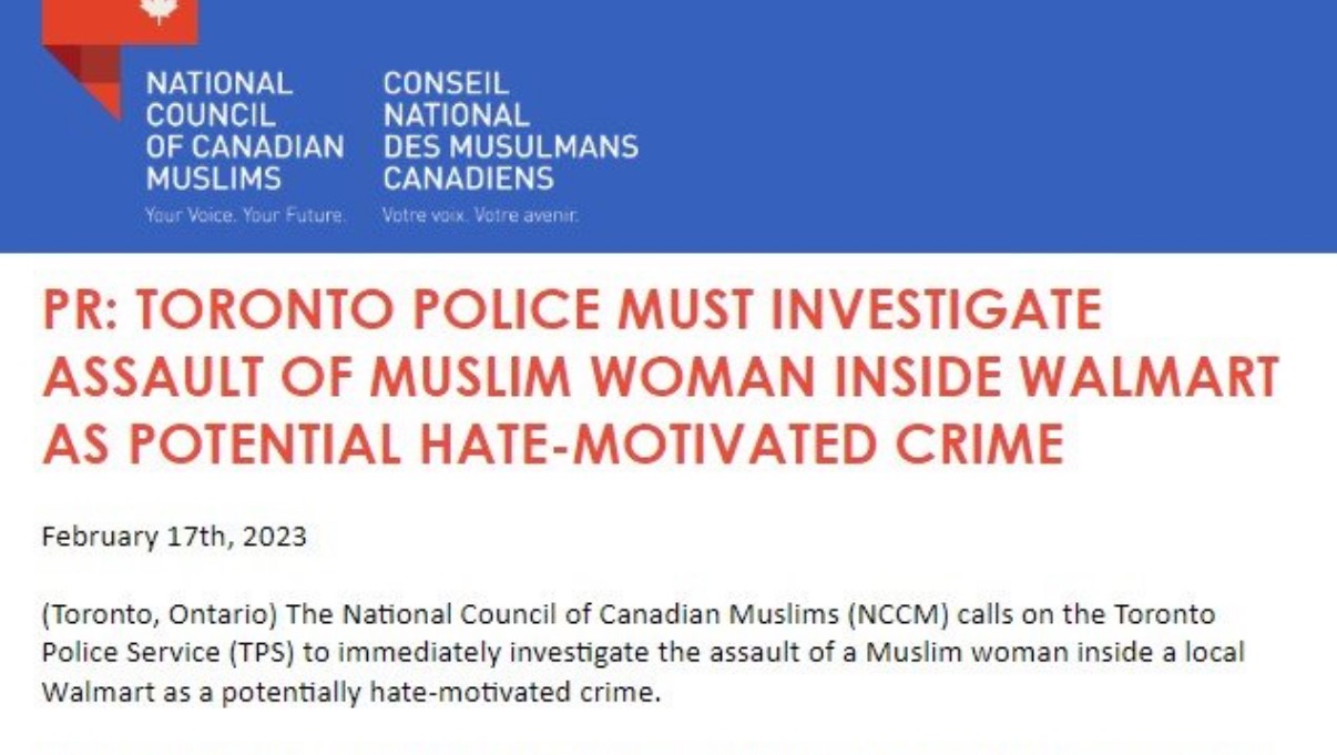 https://www.iqra.ca/2023/toronto-police-urged-to-investigate-assault-on-muslim-woman-at-walmart-as-possible-hate-crime/