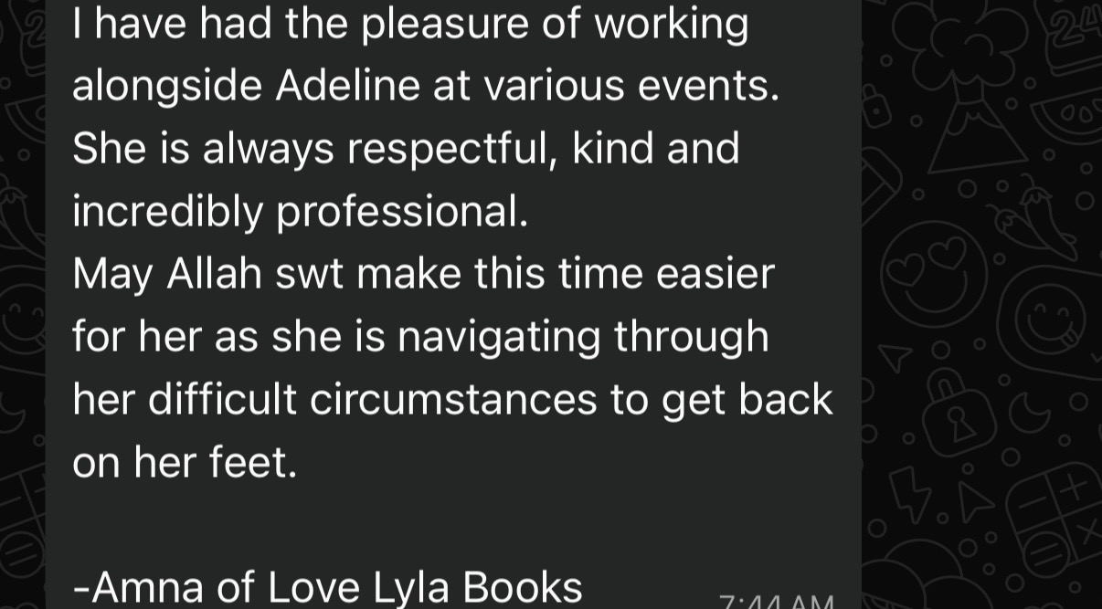 Those who were and are still involved in these claims against my honour and against my need for zakat, never requested my documentation before making claims, yet their words spread widely enough to close doors that had once been open, and these claims continue to spread to this day. I stayed silent out of fear. I tried everything to survive alone. But now I have no choice except to ask — publicly, openly, humbly, and directly — for support so I can heal and return to work.