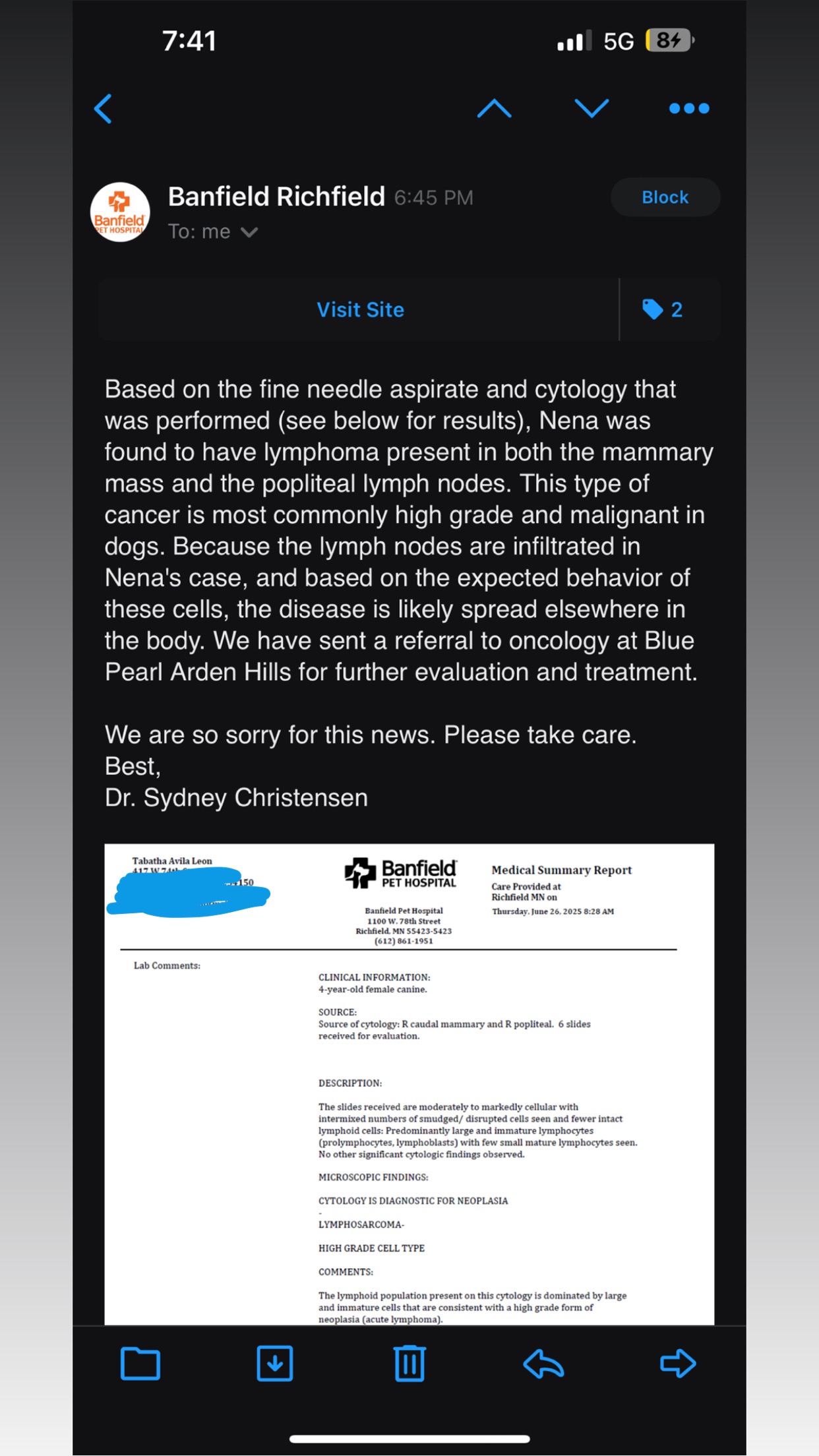 After several vet visits, blood work, and a fine needle aspirate, and other “this could be what she has” diagnosis before we actually figured out what she has we got the devastating news that cancer was found in both her mammary gland and popliteal lymph nodes. The vet said this form of cancer (lymphosarcoma) is likely already spreading in her body, and she needs to see an oncologist urgently. She’s already been referred to a cancer specialist at Blue Pearl and also I am hoping for cancellations so Nena can get a spot at the U of M for further treatment and evaluation.