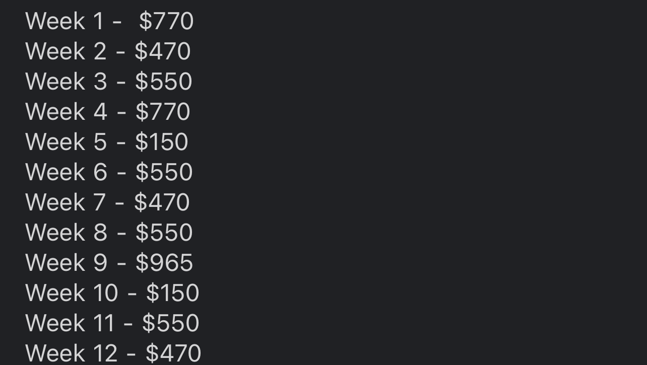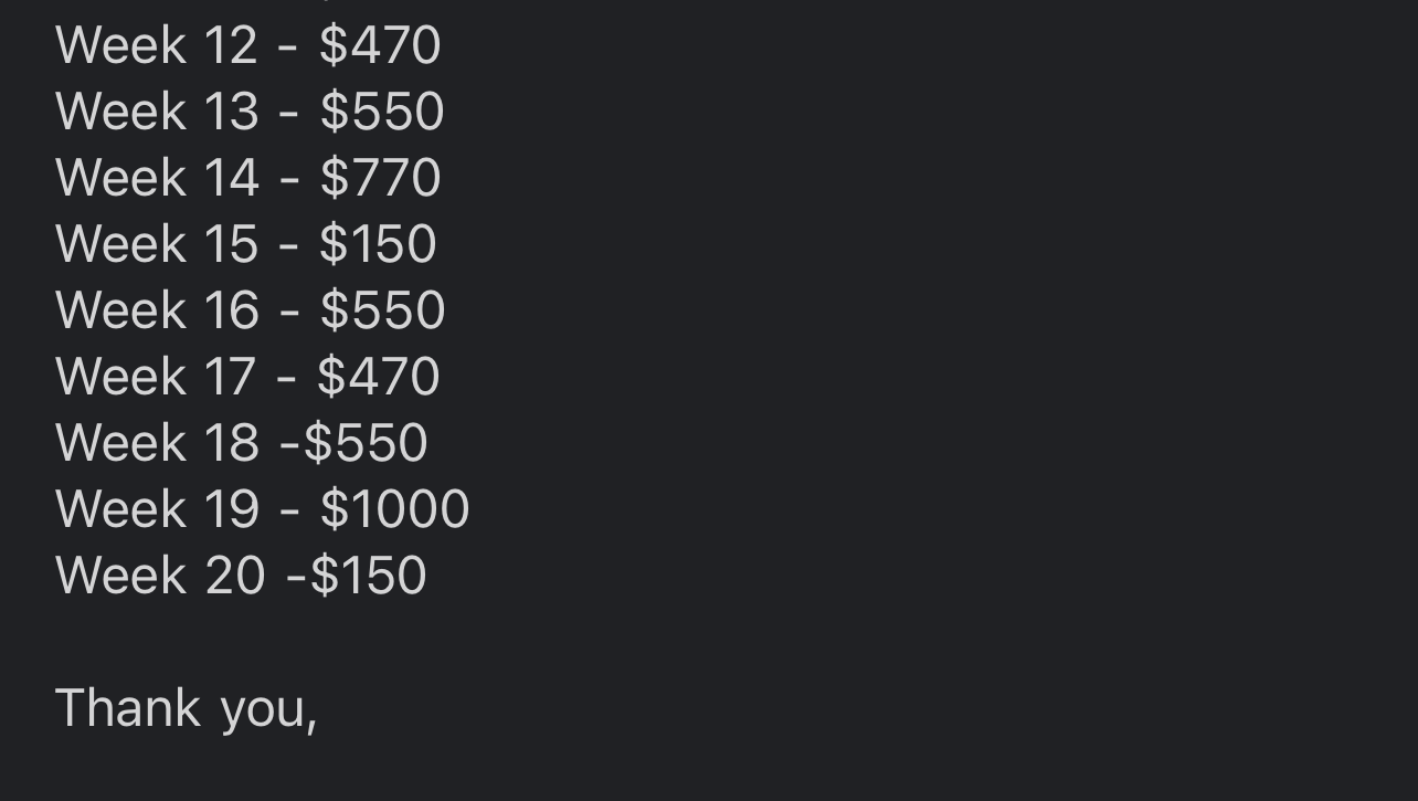 here is a breakdown of the weeks: