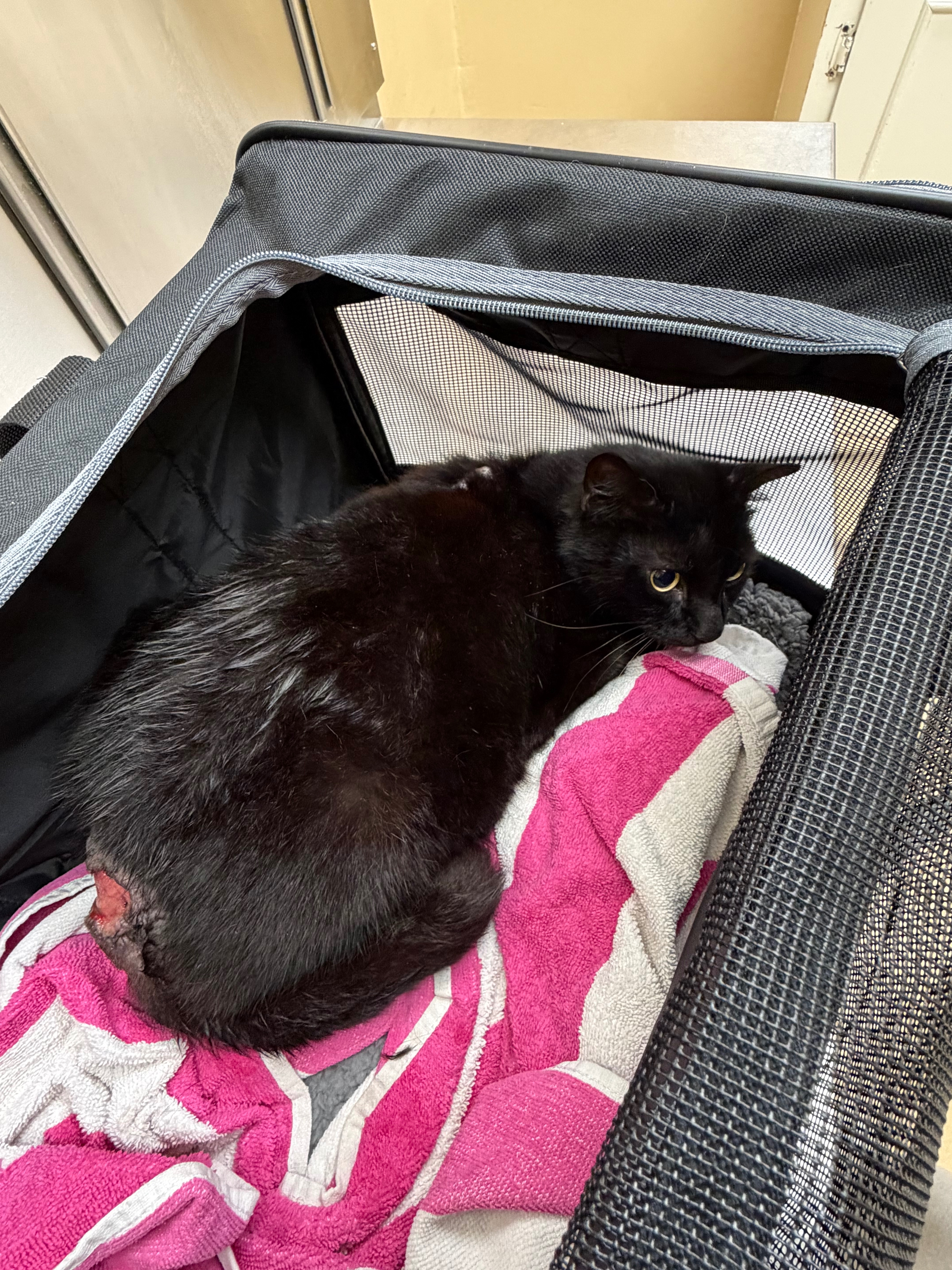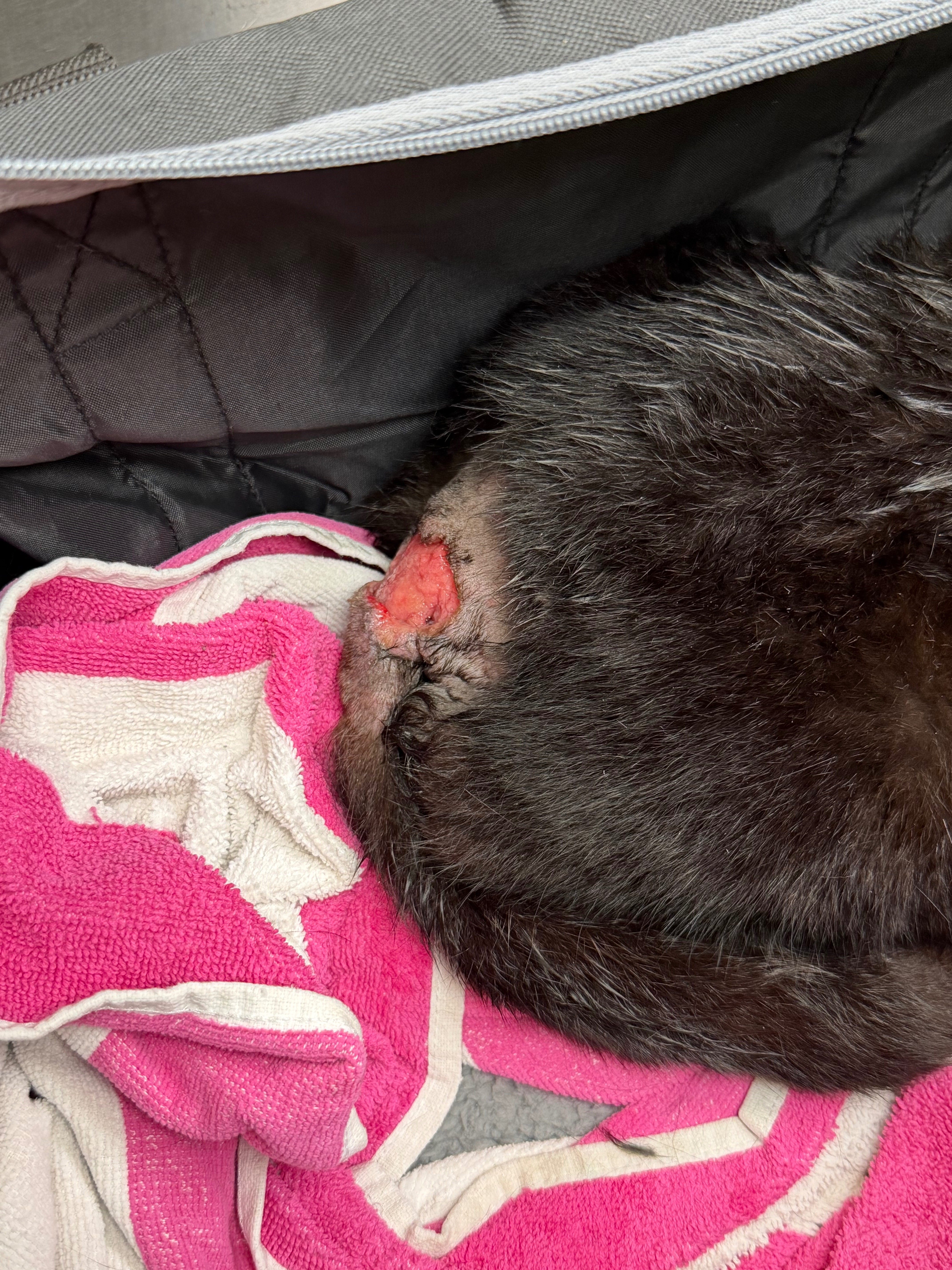 My sister was finally able to catch him, and we brought him to the veterinarian. They cleaned the wound and told us he needs stitches and antibiotics. For that, he has to be sedated, and all of this is included in the cost of the goal I’m setting here. The vet also explained that once they sedate him and suture the wound, they will be able to tell me his sex, since right now they don’t want to move his tail to avoid causing more pain, as he is likely in a lot of discomfort.