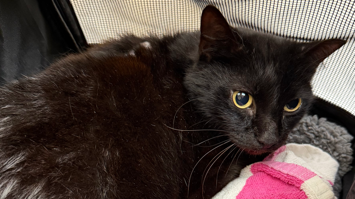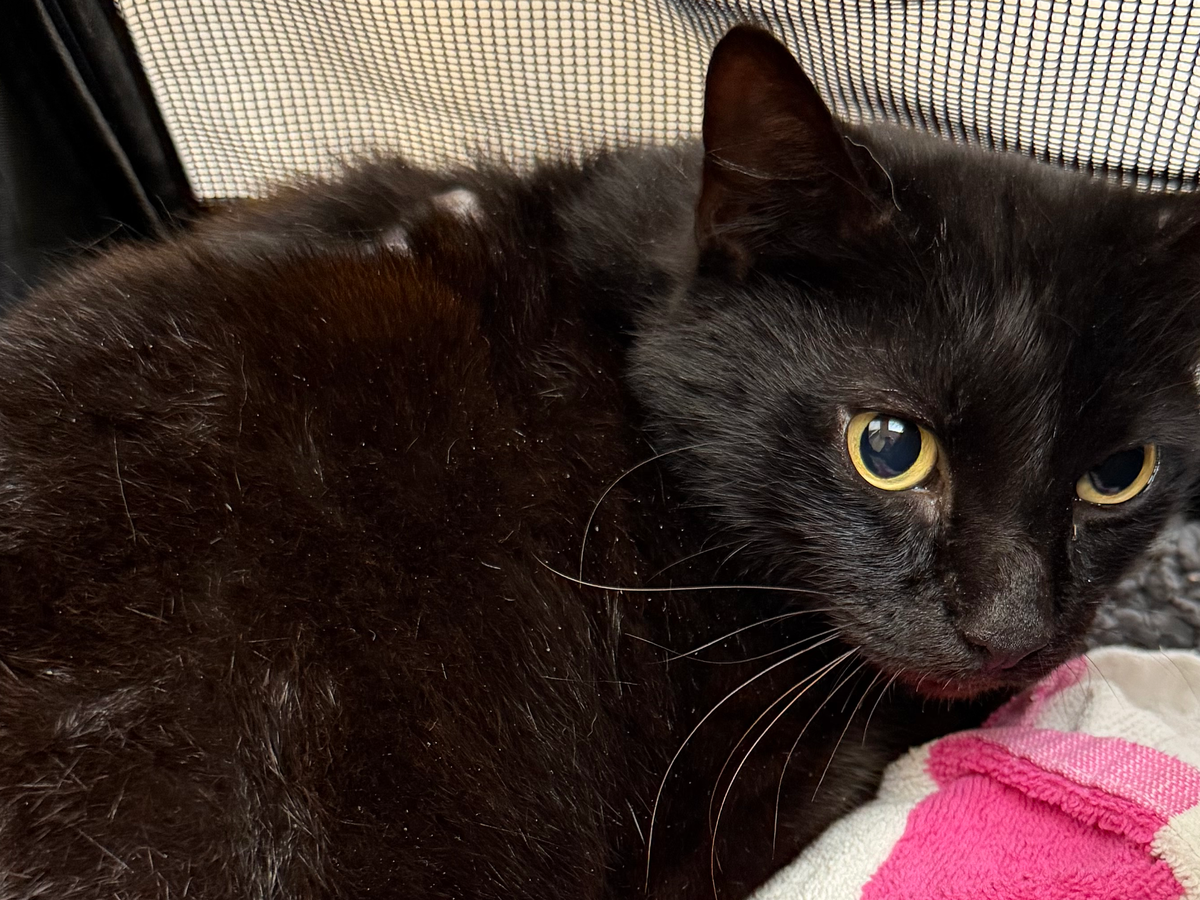 Hi, my name is Natalia, and I always leave food in my backyard because I know there are several stray cats that come to eat. This cat hadn’t come around before. He started showing up about a week ago, and when I first noticed him, he had some bald patches and what looked like an abscess. I tried to catch him, but he would run away. I was afraid that if I pushed too hard, he wouldn’t come back, and at least here I knew he was getting food.