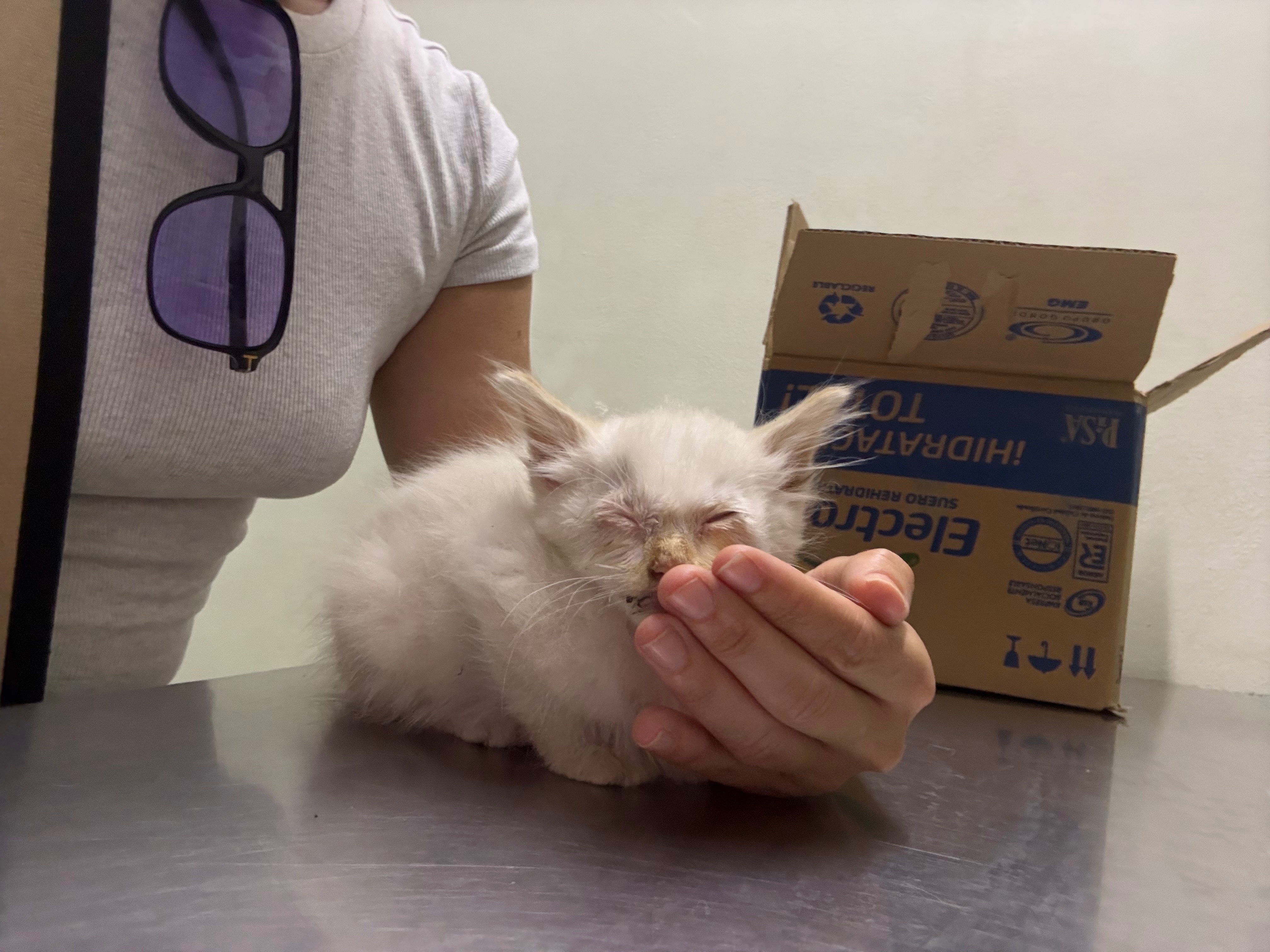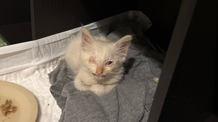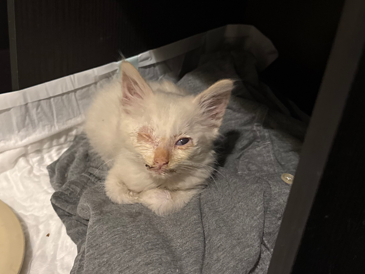 I brought him to a vet that same night. The vet confirmed he had a serious eye infection, respiratory symptoms, fever and started him on medication immediately. He’s now safe, warm, eating, and beginning to recover, but he has a long road ahead.