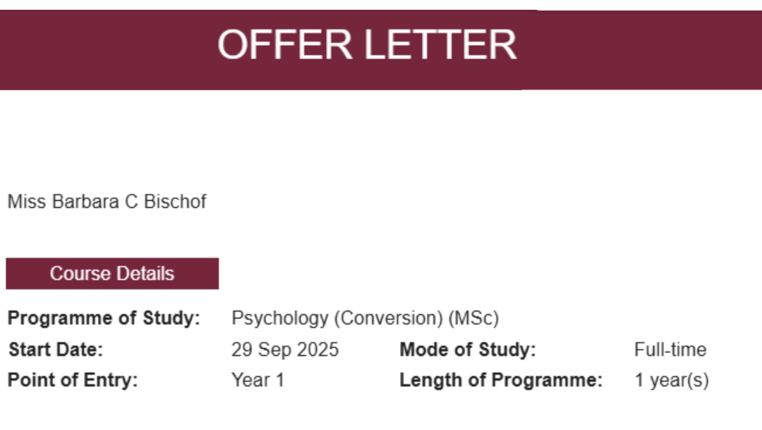 (28/07/25) Hello, my name is Barbara, and I’ve just been accepted into a Master’s programme in Psychology in London — a dream I’ve carried in my heart for many years.