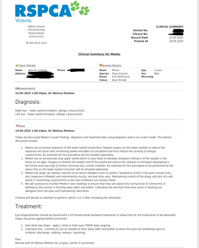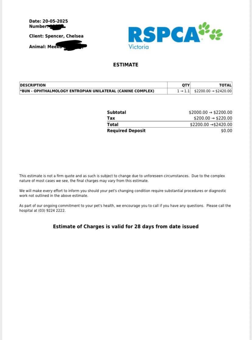 The only way to give Meeko the chance at a pain-free life is through a specialist double entropion surgery, which has been quoted between $2,200–$2,500. This will be done through RSPCA with their ophthalmologist specialist, who will perform the entropion surgery on Meeko’s upper lids and correct the previous surgery on his lower. I’ve explored every option I can, loans, payment plans, and charities but I simply can’t afford this on my own.