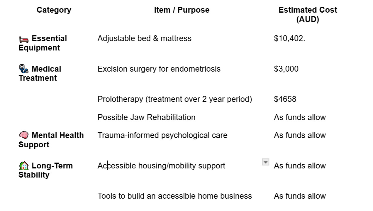 Thanks to her determination and persistence, Mel has made remarkable progress. She’s fought hard for every small improvement in her quality of life. Mel has fought for her quality of life and sought out her improvements through a combination of various treatments, therapies, surgery, nutrition, mindset, and nervous system regulation practice. While Mel is grateful for the improvements so far, she recognises she still has a long way to go. She has worked hard for many years to exhaust the resources available to her and needs support to continue to improve, pursue her goals, and reach a better quality of life.