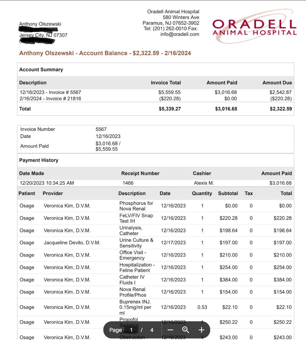 Osage is FIV+. He had two vet visits and hospitalization for a urinary infection and blockage. The total bill was over $5,000.