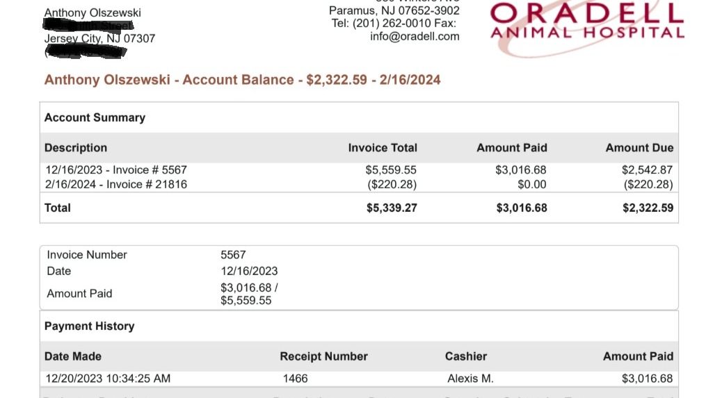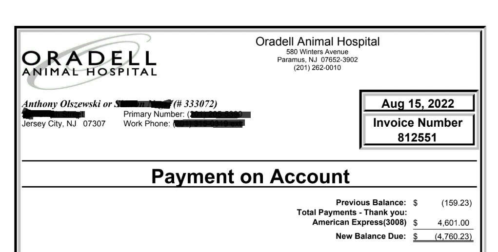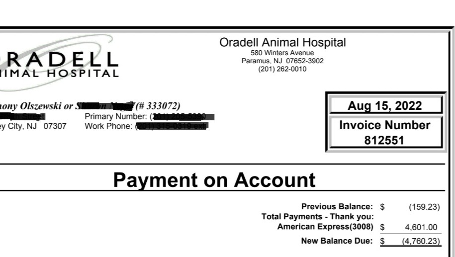 Storm Baby was rushed to an emergency vet on a Saturday night. They helped us by caring for her immediately but not checking her in until midnight on Sunday. This saved us from a charge for one day's hospitalization. The bill still was in the thousands of dollars.