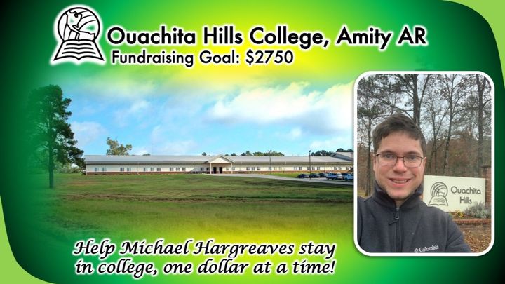 Hi friends! I’m fundraising to help me stay in college. I attend a private Christian College near Amity in rural Arkansas where I am studying theology. I have really grown a lot from my time at this college, and since I am so close to finishing I really want to be able to stay in school till I reach the finish line. If I am able to stay in college, I will be able to graduate in the Fall is 2022. Recently, our college decided that we would be required to pay the entire fee for the semester before we could register for classes. This fee amounts to $2750. Since we are in the trimester system, we will have to pay the $2750 twice before the summer. What I am trying to do is pay my tuition through canvassing (raising small donations in exchange for Christian books). However, canvassing alone will not bring in sufficient funds for me to finish school. I am seeking supportive individuals who would be willing to match every dollar I earn while canvassing up to $2750. These funds will go straight to pay my tuition at Ouachita Hills College in Amity, Arkansas. Anything you can help out with to match my canvassing earnings would be greatly appreciated and would help me finish school. After school, I want to go to the mission field to serve God. My tentative plan is to go to the Congo (DRC) and I am currently studying French in preparation. If God puts it in your heart to help out, I know your investment will be richly repaid. Please share this  fundraiser with anyone you think would be willing to help out!