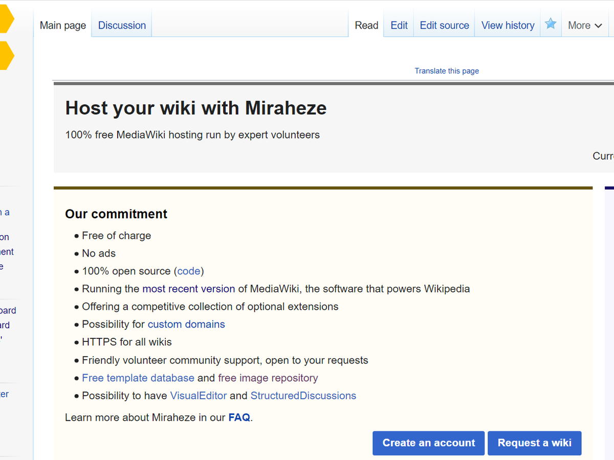 Miraheze is a not-for-profit and open source project with the purpose of providing free and accessible online collaborative and editing environments to communities, organisations and individuals alike. Since 2015, we have been providing high-quality wiki hosting and support to serve thousands of communities. Miraheze runs on the power of volunteers contributing in various ways, such as writing content, handling support requests and funding the organisation. The project model is community-centric and gives all stakeholders an important voice in the development of Miraheze. Miraheze is an ad-free and independent wiki farm; therefore, all donations are provided by community members.