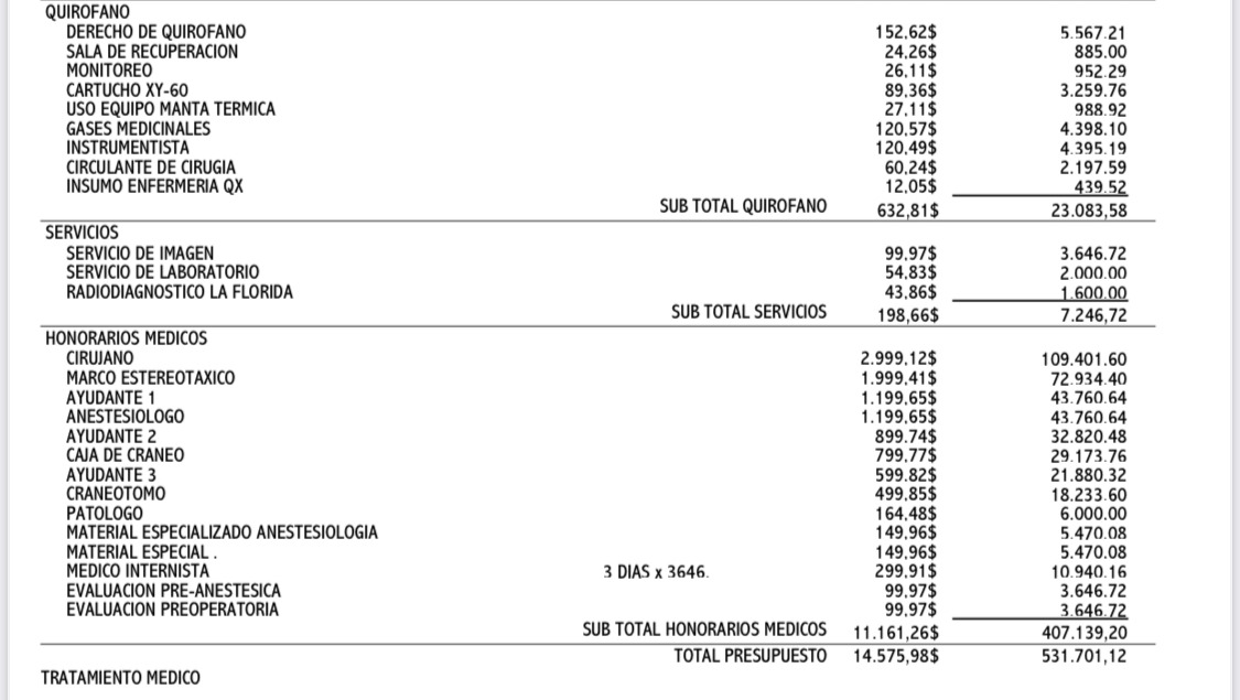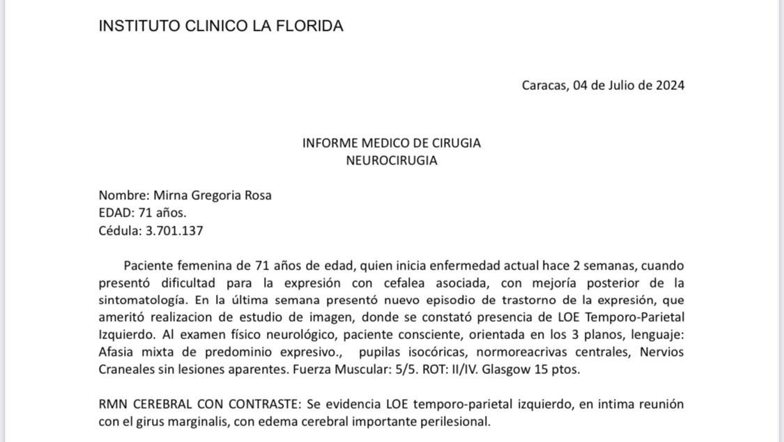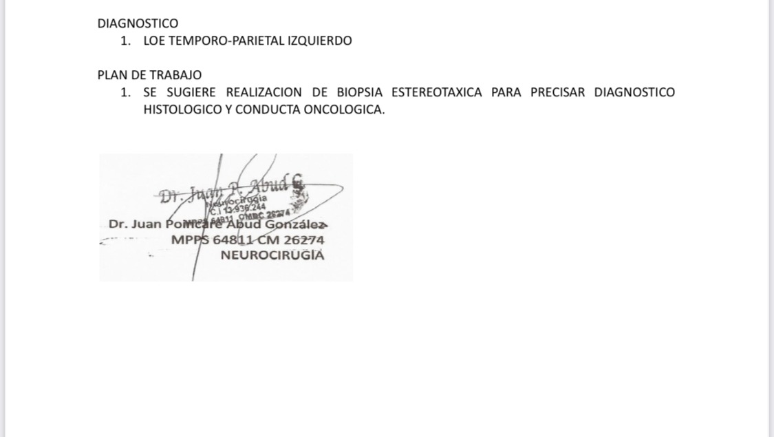 Para empezar, nuestra mamá necesita hospitalización urgente, seguida de una biopsia cerebral estereotáxica, un procedimiento altamente especializado que se realiza mediante navegación quirúrgica avanzada para extirpar tejido cerebral, el cual debe ser evaluado. Una vez que los resultados de la biopsia estén disponibles, la necesidad de tratamiento oncológico/canceroso es inminente.