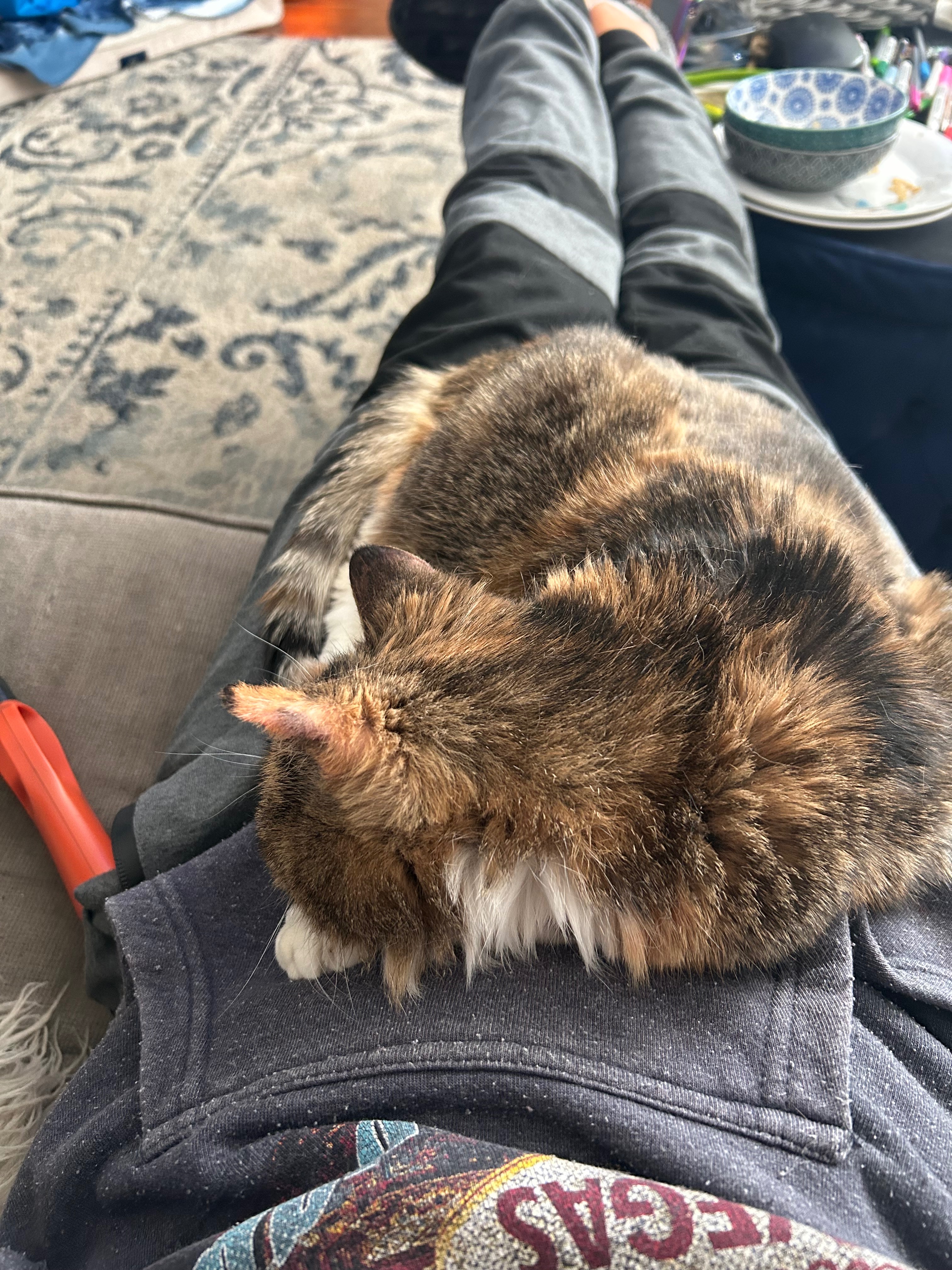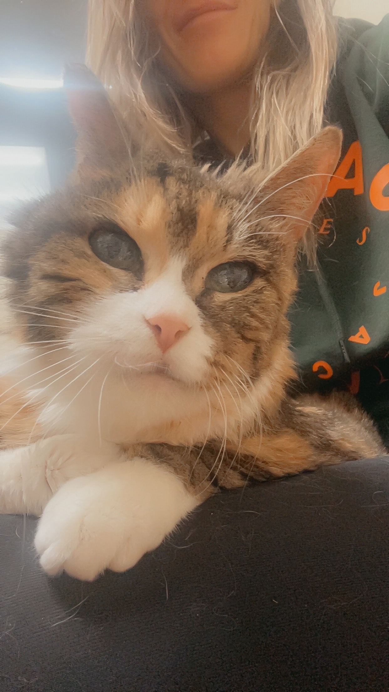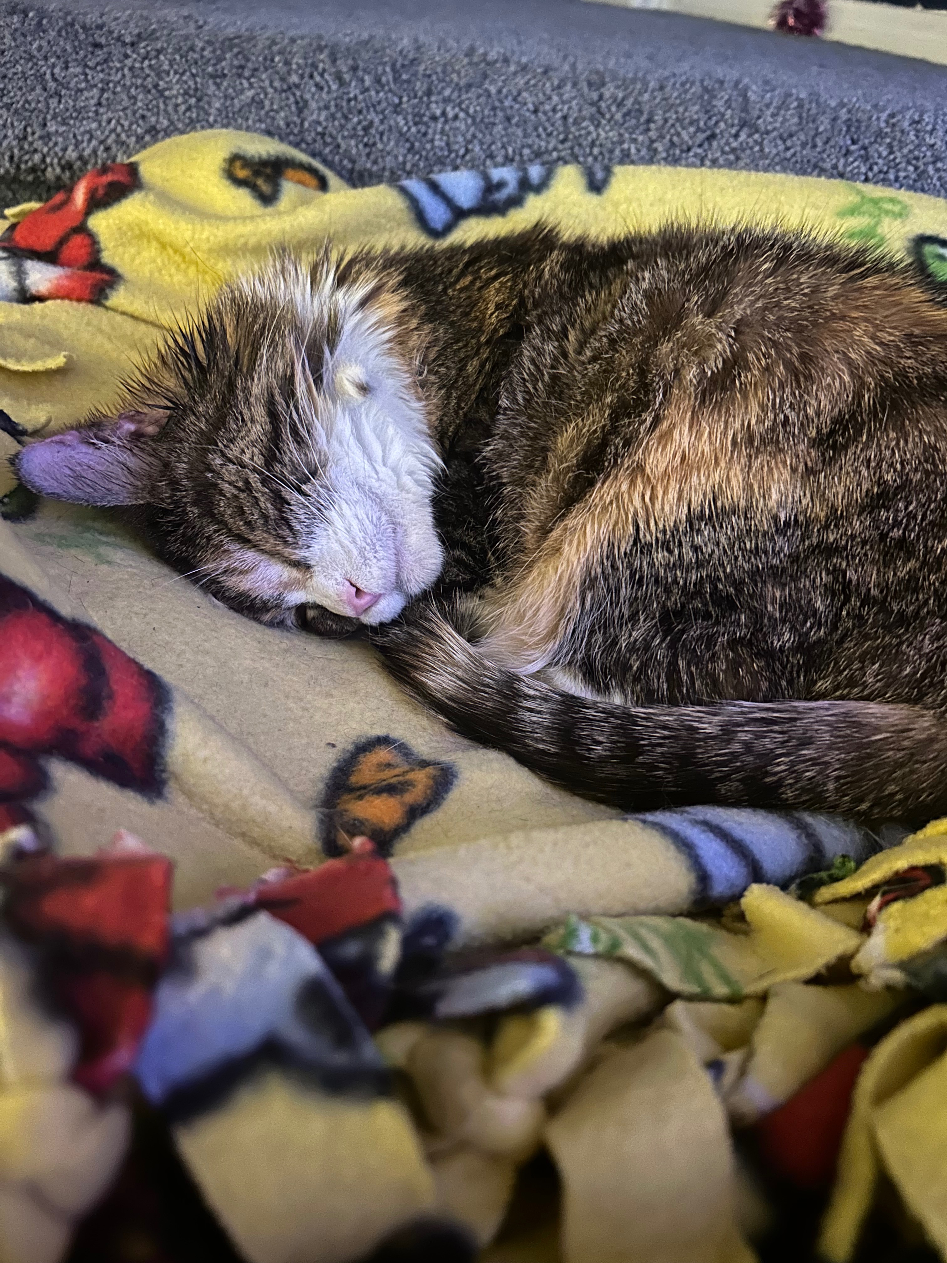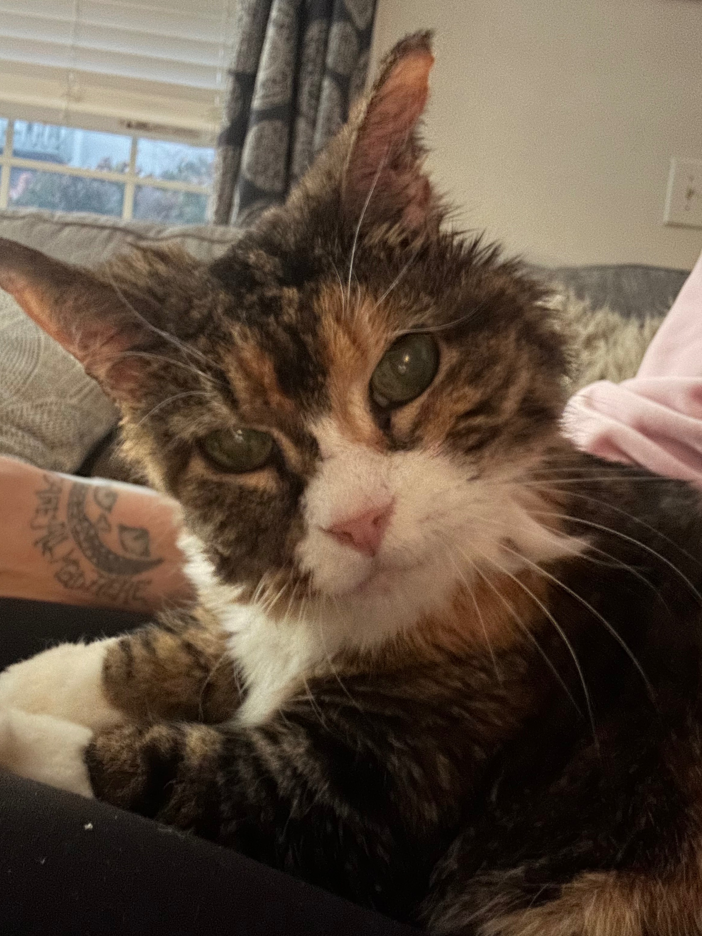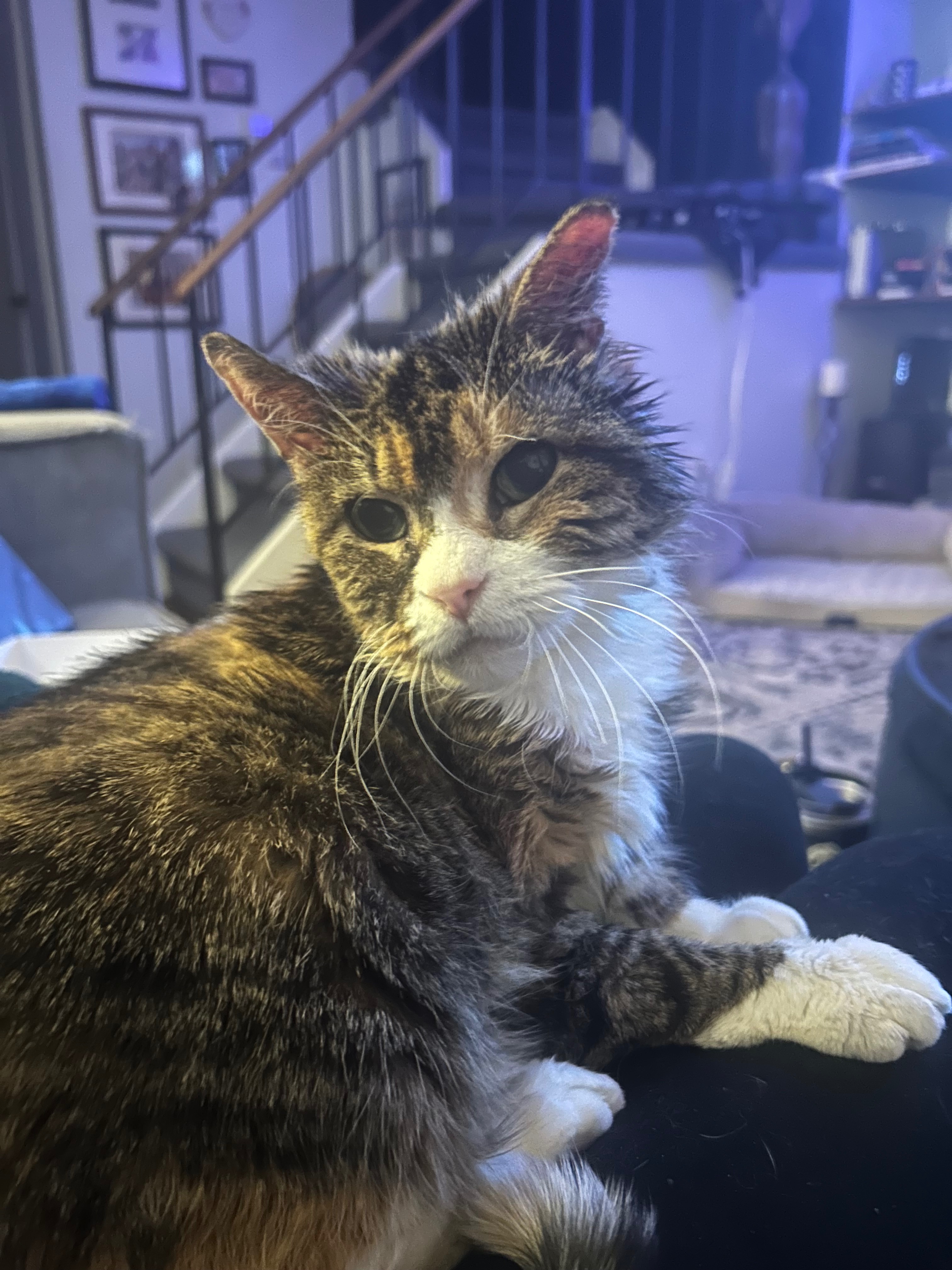 Her living conditions were truly awful. She slept in her very used cat litter box because it was the cleanest place for her to lay. The box was rarely, if ever, changed, and it was clear she was just trying to find any comfort she could. Since then, I’ve learned that Momma Kitty is deaf from untreated ear mites, and she’s scratched her right ear so much that half of it is gone. She walks with a lean and cries out in pain when her ears bother her. Despite everything, she’s incredibly sweet and just wants to be loved. She has the cutest little meow—since she can’t hear herself, she meows loudly and often, always looking for reassurance that I’m still there. I’ve done my best to care for her, but the vet bills are overwhelming. The initial visit alone is expensive, and she’ll need ongoing medication and possibly treatment for skin issues from her past living conditions.