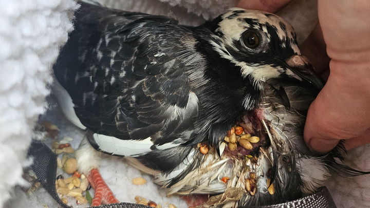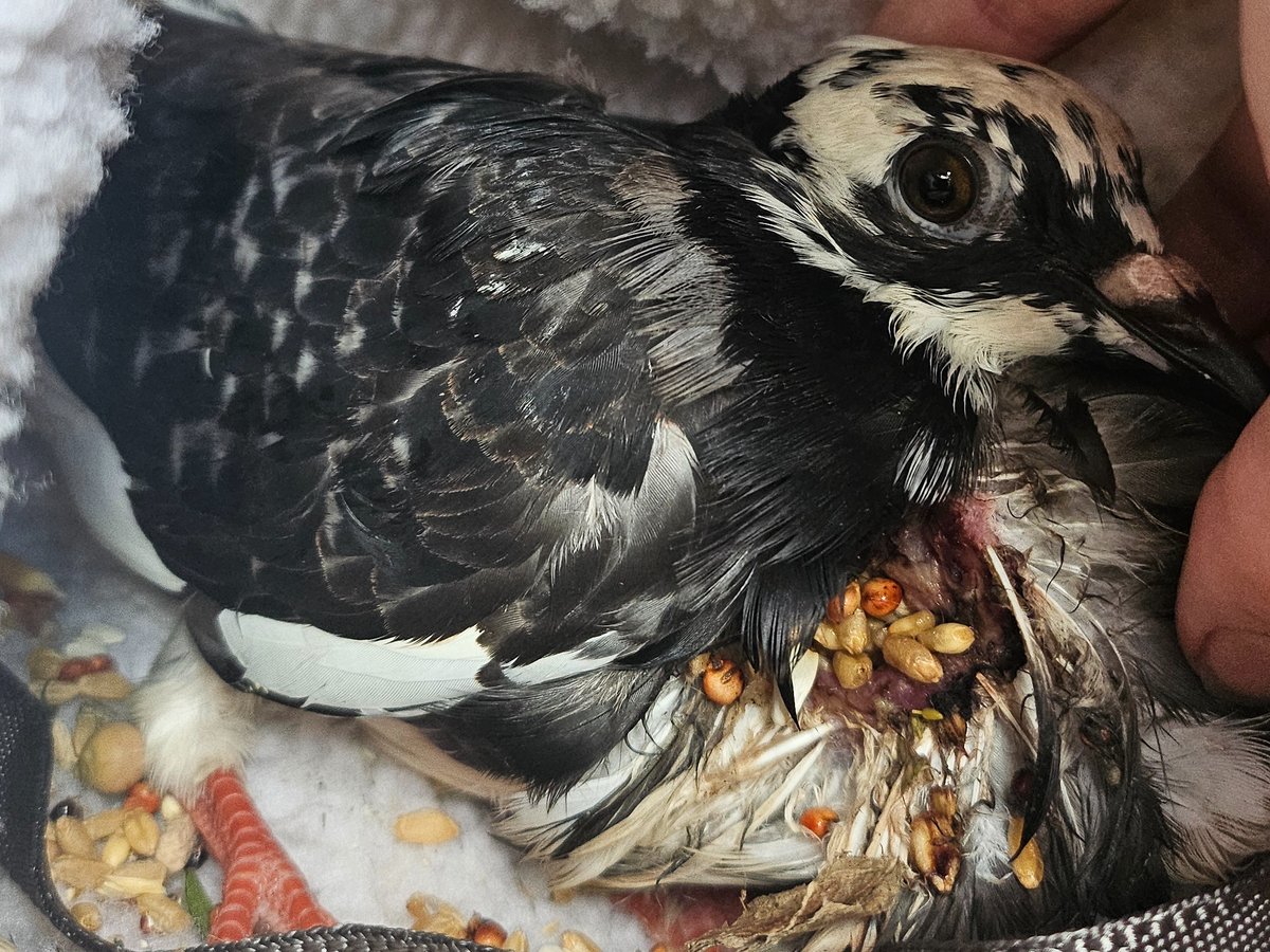 My name is Brooke and I'm a dedicated pigeon rescuer. Reently Moo appeared in my local flock with a severe crop injury. The crop — the pouch pigeons use to store food — had torn open, leaving a large wound in her chest. When she tried to eat, seed was falling straight out.