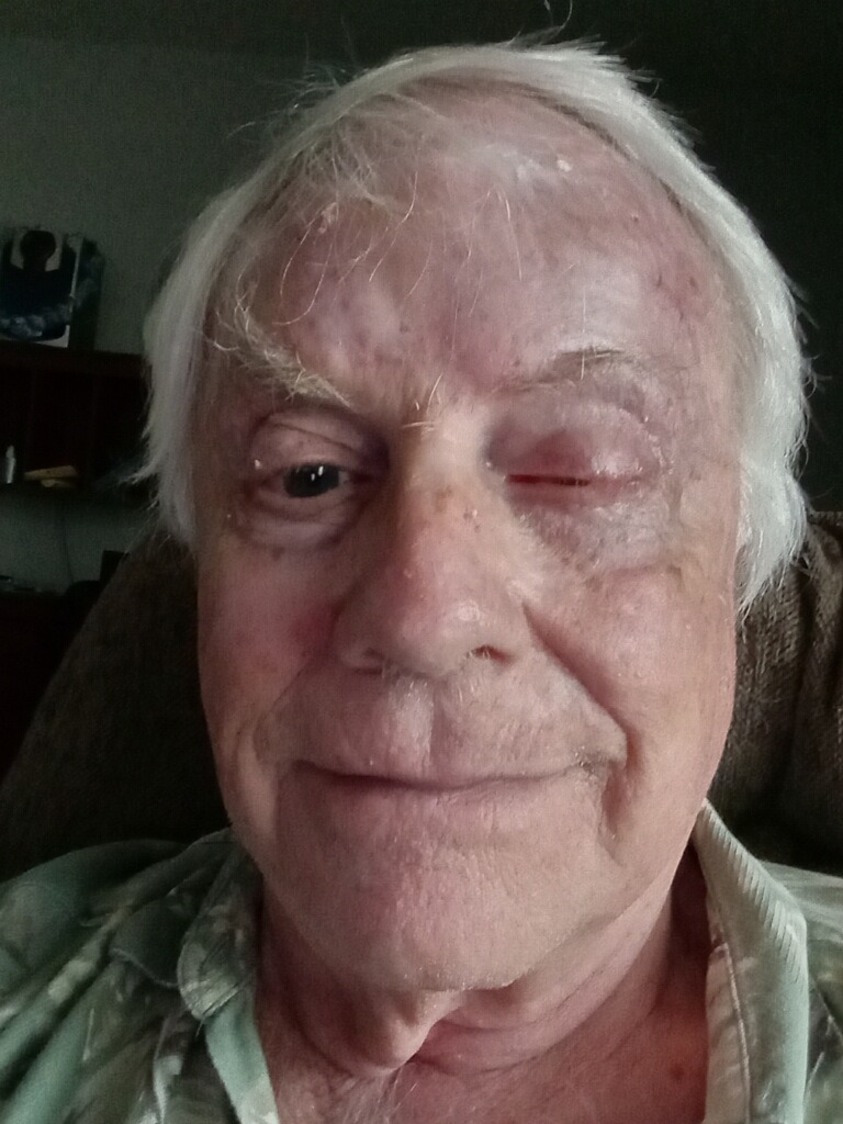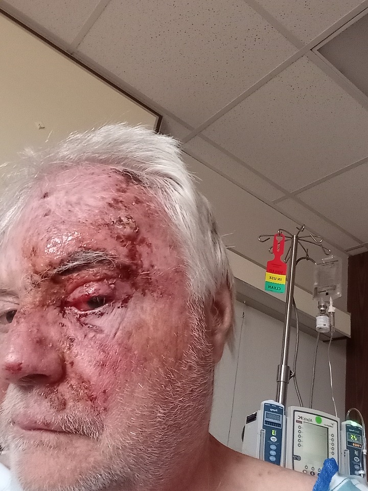 After beating cancer (pics are too graphic), Tom developed what appeared to be an eye infection in April of 2024. Fast forward to December of the same year, and he had finally been diagnosed properly as having shingles but ultimately lost sight in his right eye. He only has 20/200 vision in the left and earlier this year, he had surgery to permanently close the right eyelid.
