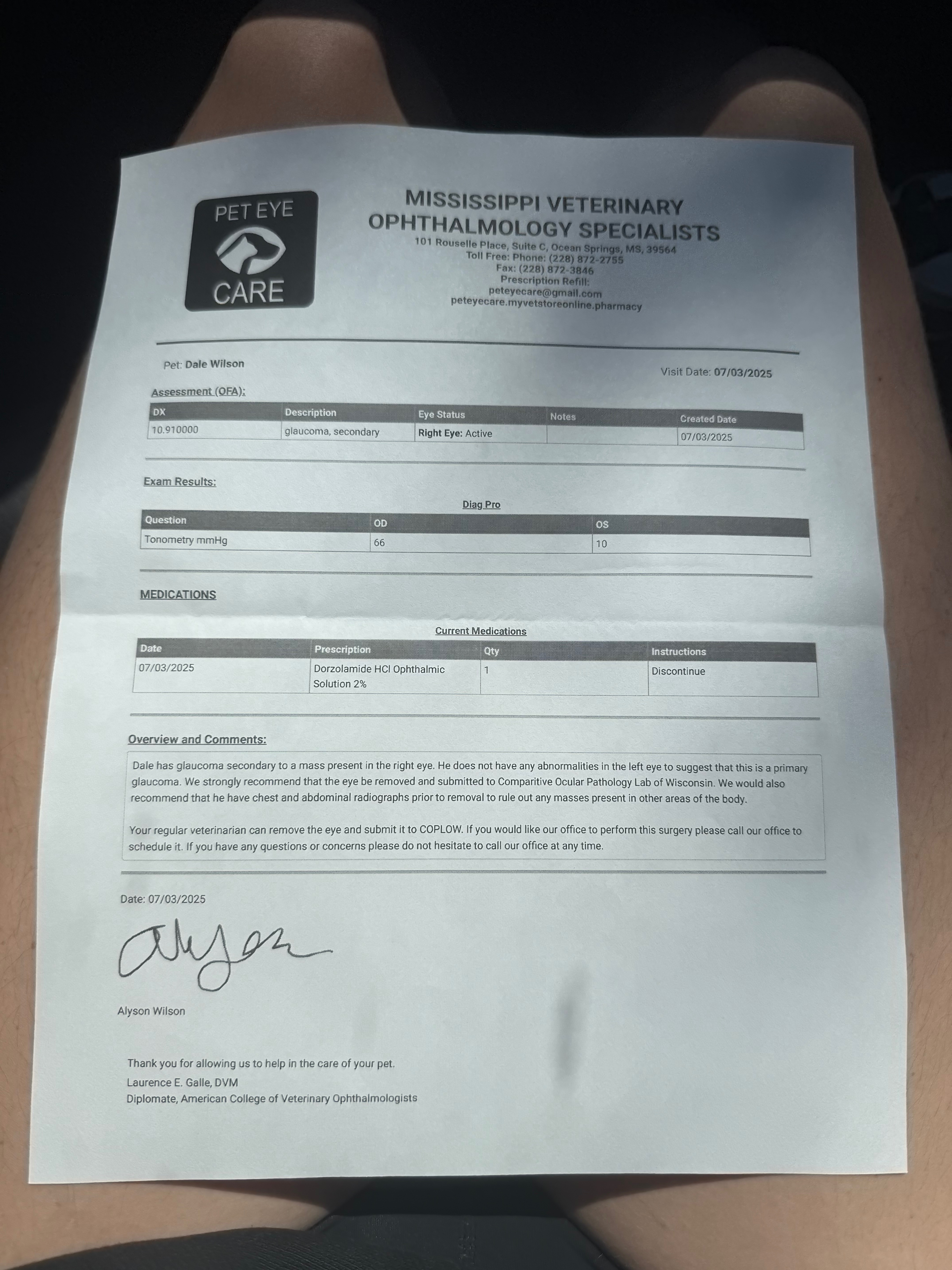 Recently, Dale was diagnosed with secondary glaucoma, a painful and aggressive condition that quickly robbed him of his vision in one eye. Despite medication and all the care I could give, the disease progressed, and the only option left was surgery to remove his eye and stop the pain.