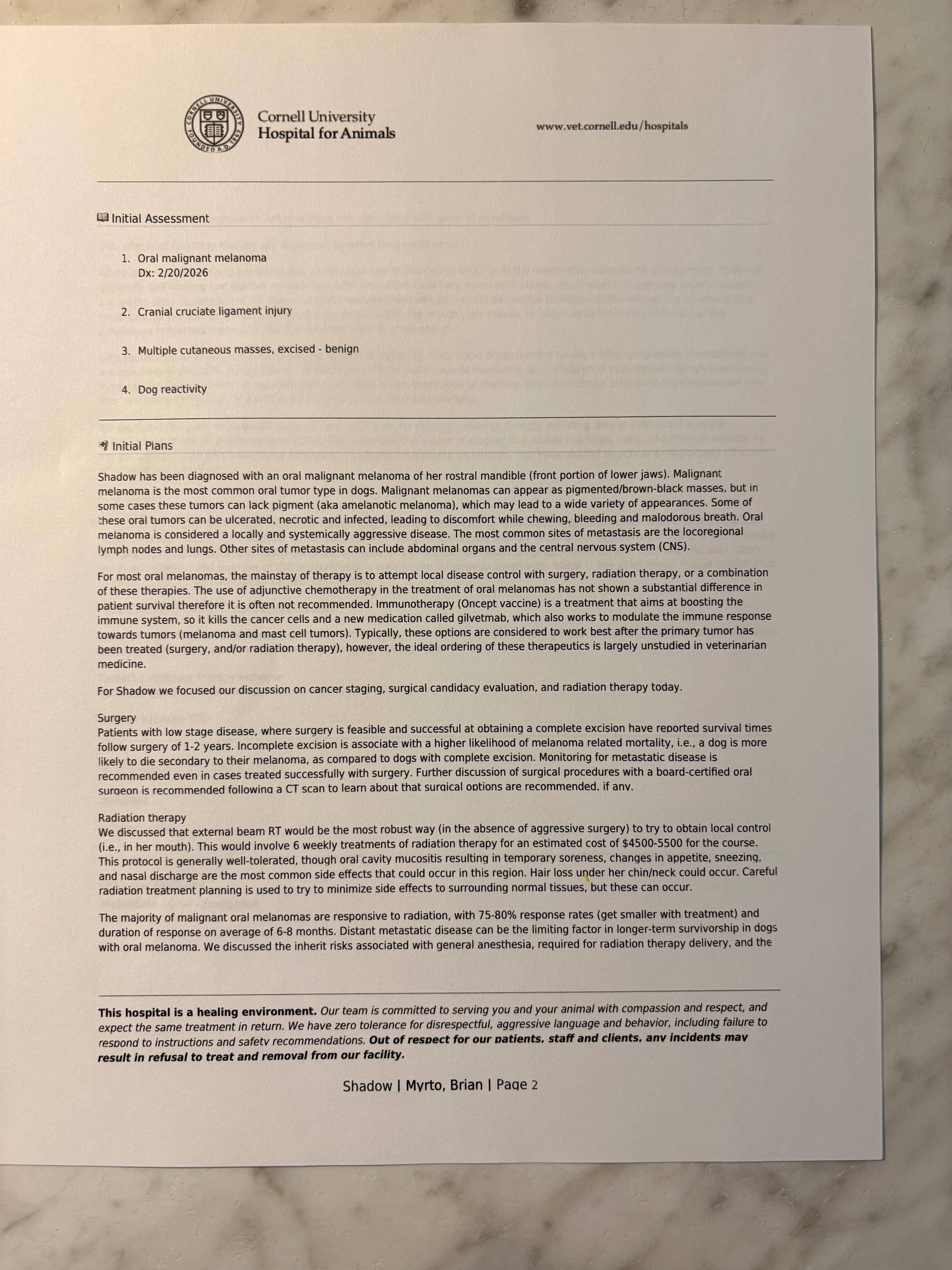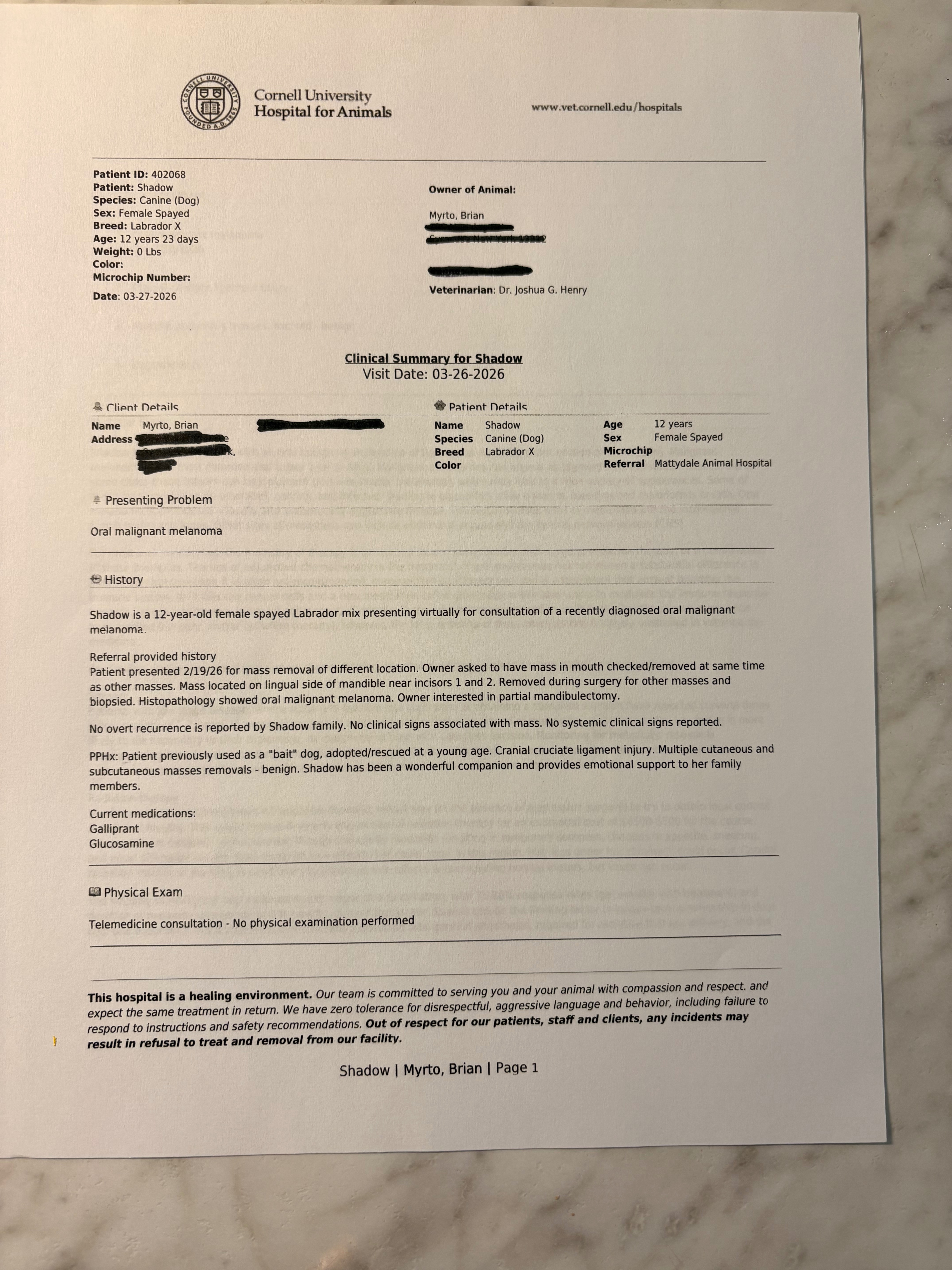 We were asking everyone to call Cornell directly, but I received a phone call this morning from Wendy, the client service manager at Cornell, and was told they had some people calling to donate to Shadow's account, but they do not accept donations for one specific pet,the donations they accept are for the university. So, we were given incorrect information at our consultation appointment. She suggested making a new GoFundMe. I know with all the scams out there, people don’t want to help because they think the money is not going to where they are being told, but I am being completely honest - I am not a liar or a thief, and the money will be going for my baby girl's cancer treatments. I am going to give updates on everything we are told, along with paperwork and receipts.I’m extremely desperate. I want to start by telling you about our beautiful dog, Shadow. She is a Labrador retriever and is almost 12 years old. We rescued Shadow when she was four months old; she was being used as a bait dog. After we rescued her, she turned out to be an amazing, loving dog; she is the sweetest. Shadow underwent surgery on February 19th to remove two masses, one located on the top of her head and the other on her upper eyelid. During the procedure, the doctor discovered a third mass in her mouth, which prompted him to express concern regarding its color and appearance. He recommended its removal, and we agreed to have it removed. The doctor suggested sending the masses for testing, and the results revealed that the mass in her mouth was melanoma, while the other two masses were benign. Fortunately, it was detected in time. The vet referred us to Cornell; our vet stated that if it were his dog, he would seek consultation with them. They will perform a CT scan to ensure the cancer has not spread to her lungs or lymph nodes. Given Shadow's overall good health, the doctor believes that with treatment, her life can be prolonged for five to six years or longer. We are deeply attached to Shadow, who serves as my husband's and my emotional support dog and is essentially our baby. We are deeply heartbroken. Animals may be perceived as just pets to some, but to us, Shadow is our daughter and baby. Over the years, we have spent a lot of money on doctor bills for our animals, our babies. My husband and I both suffer from complex PTSD, and having her has drastically changed our lives forever. She has turned out to be the perfect emotional support dog that knows exactly how to help us cope with our problems. We now have to take her to Cornell on April 2 for a full-body CT scan to determine if it has spread anywhere else. We had a consultation with the oncologist at Cornell on March 26, 2026, and he believes, based on the biopsy results, that this was found early enough that they can treat it and/or do surgery if needed. We unfortunately cannot afford these huge vet bills that will be coming with her treatments. I am the only one working, as my husband is fully disabled and cannot work. We are looking for a little help to try and help our baby girl and give her the best chance at beating this cancer. She has done so much for us that she deserves the best chance to beat this. She is in excellent health right now, and they said she is an excellent candidate to beat this and could live another five or six years or longer. So, we are asking that anyone who could donate to help us get the care that our baby girl needs, we would greatly appreciate it. If there is money left over from Shadow's treatment, we will donate that money to Cornell Animal Hospital for the university to help other animals in need; that is a promise. Thank you so much for your support and thank you in advance; it means more than anyone will ever know. Even if you cannot donate, please, I am begging, just share this GoFundMe.