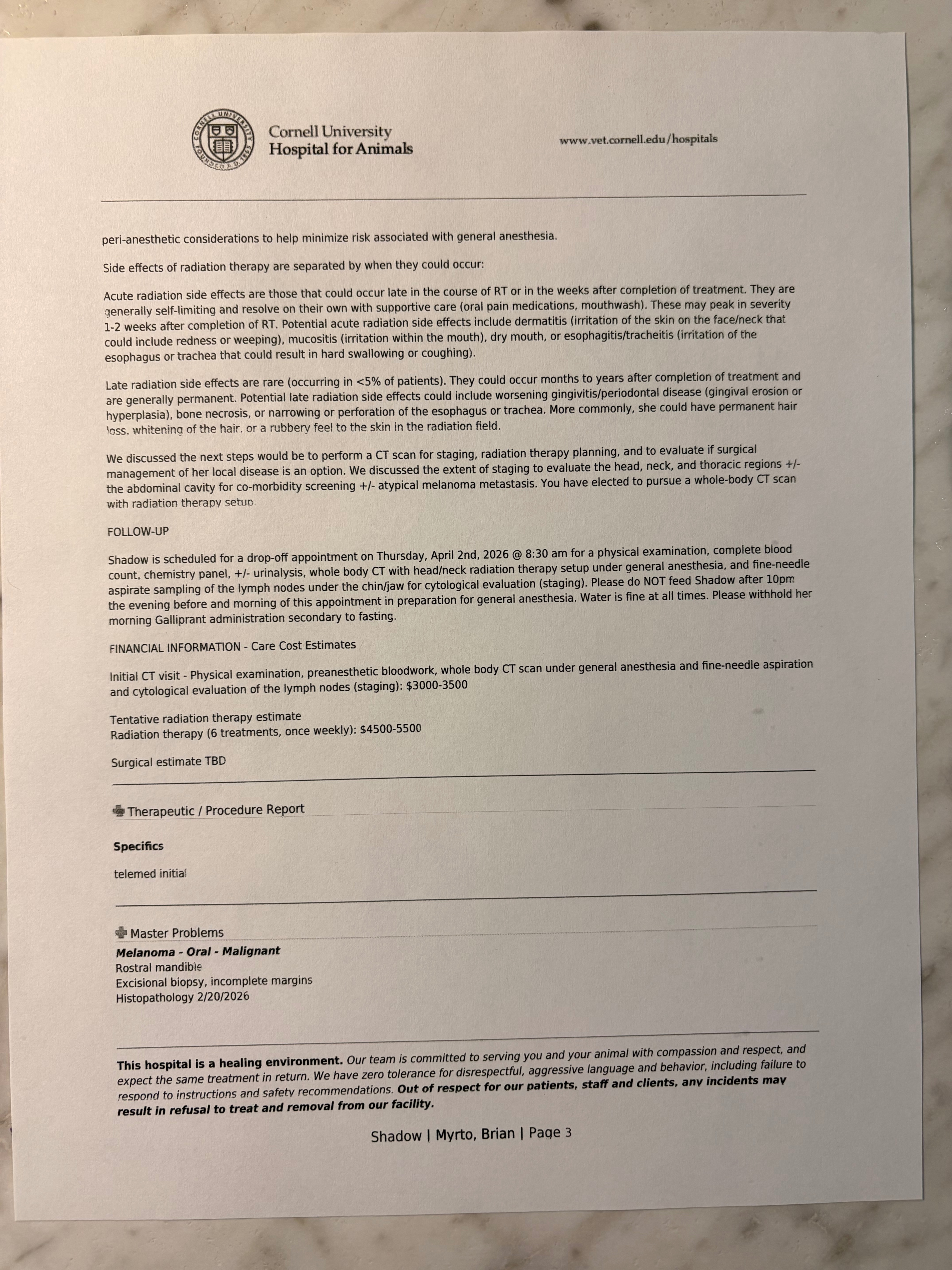 Shadow’s cancer fund covers her CT scan and treatment at Cornell for more healthy years
