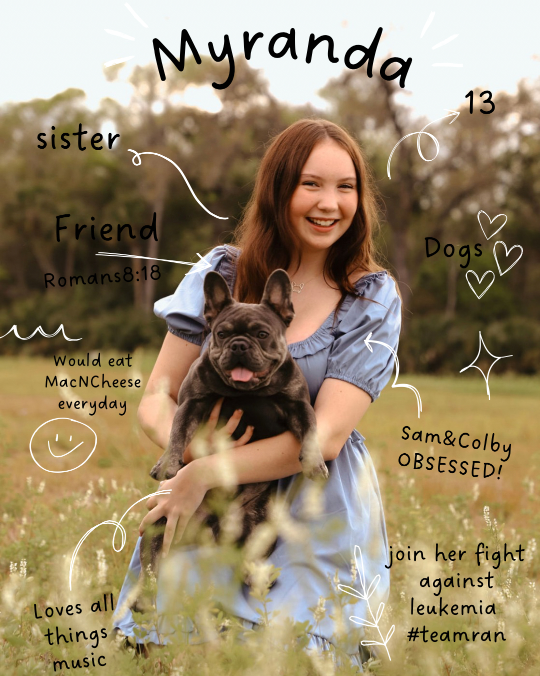 With heavy hearts, our beautiful, bold, witty, 13-year-old daughter, Myranda Drew, was diagnosed with Leukemia. This is a diagnosis no family ever expects to hear.