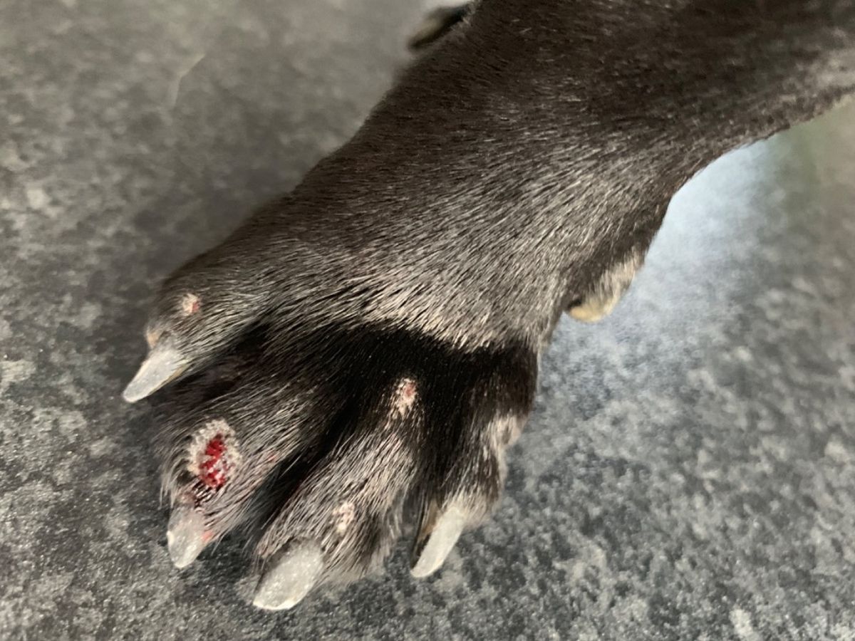 balance and is causing him to drag and scuff his front paws to the point of them bleeding,