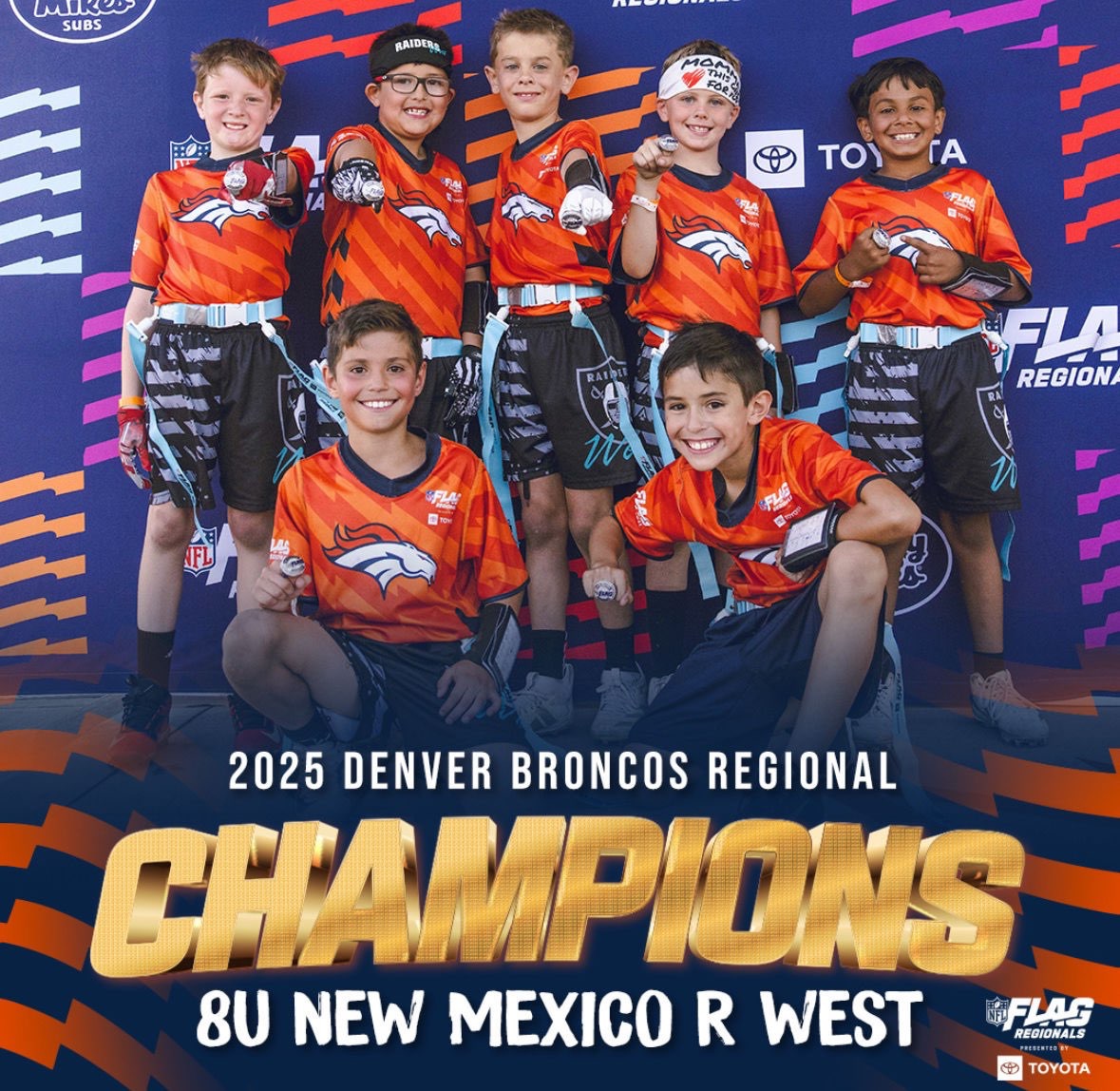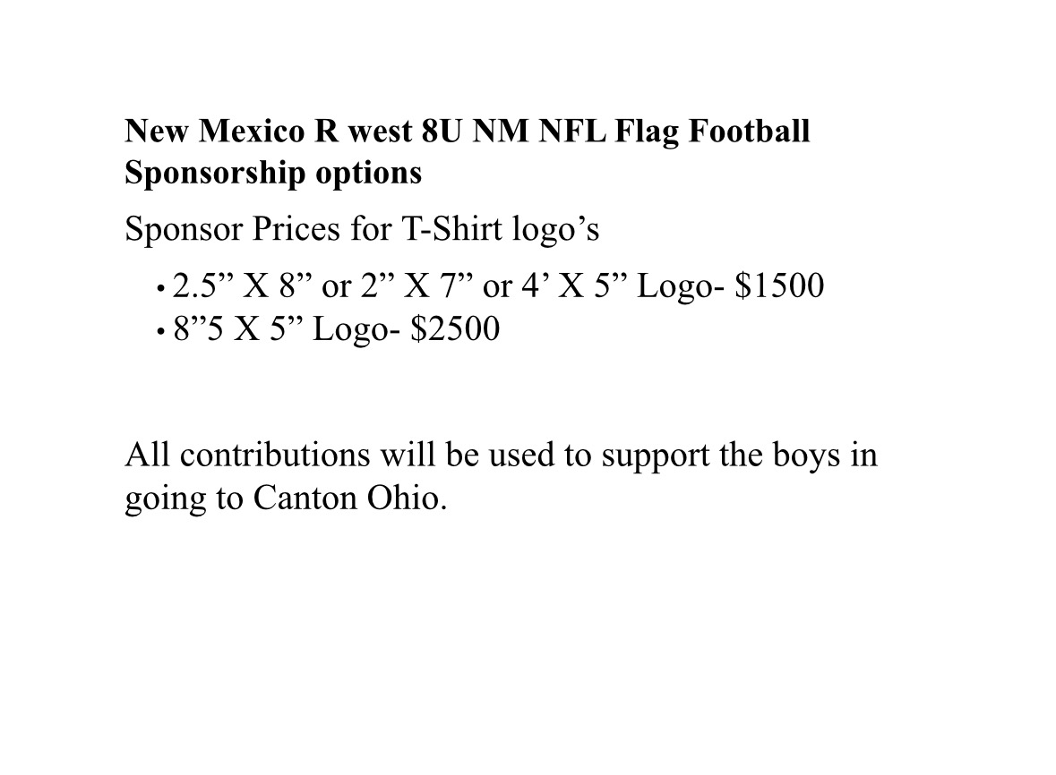 My name is Jerome Martinez, and I am the Head Coach of the 8U New Mexico R West youth flag football team. I am reaching out to respectfully request your support as a sponsor for an exciting and meaningful opportunity our team has earned. On May 10, 2025, our team achieved a major milestone by winning a regional tournament in Denver, Colorado. With this incredible victory, the boys have earned a coveted invitation to compete in the NFL FLAG Championships Presented by Toyota, taking place from Thursday, July 17 through Sunday, July 20, 2025. This tournament represents more than just a competition—it is truly a once-in-a-lifetime opportunity for these young athletes, who have poured their hearts into the sport and shown tremendous dedication, discipline, and teamwork throughout the season. Attending this national event would allow them not only to represent New Mexico on a major stage, but also to create lasting memories and valuable life experiences. We are currently seeking sponsors to help offset the costs of travel, lodging, and meals. Please see sponsorship logo prices in attachment. Any contribution, whether monetary or in-kind, would go directly toward supporting these deserving athletes and helping make their dream a reality. In recognition of your support, we would be proud to display your company’s name/logo on our team t-shirts. You’ll also be acknowledged in any local press coverage we receive during our journey to the championships. We sincerely hope you will consider joining our team as a sponsor. I would be happy to provide additional details or speak with you directly at your convenience. Our goal to get the team out there with one parent is $20,000. Any funds raised and not used for the tournament will be split between each player and given to the player for the registration of our next season of play. Let’s get these boys to the Championships—TOGETHER! Thank you in advance for your time and consideration.