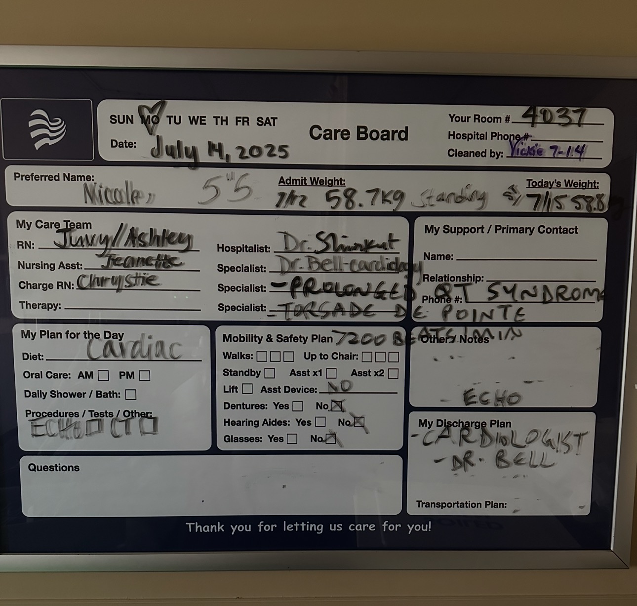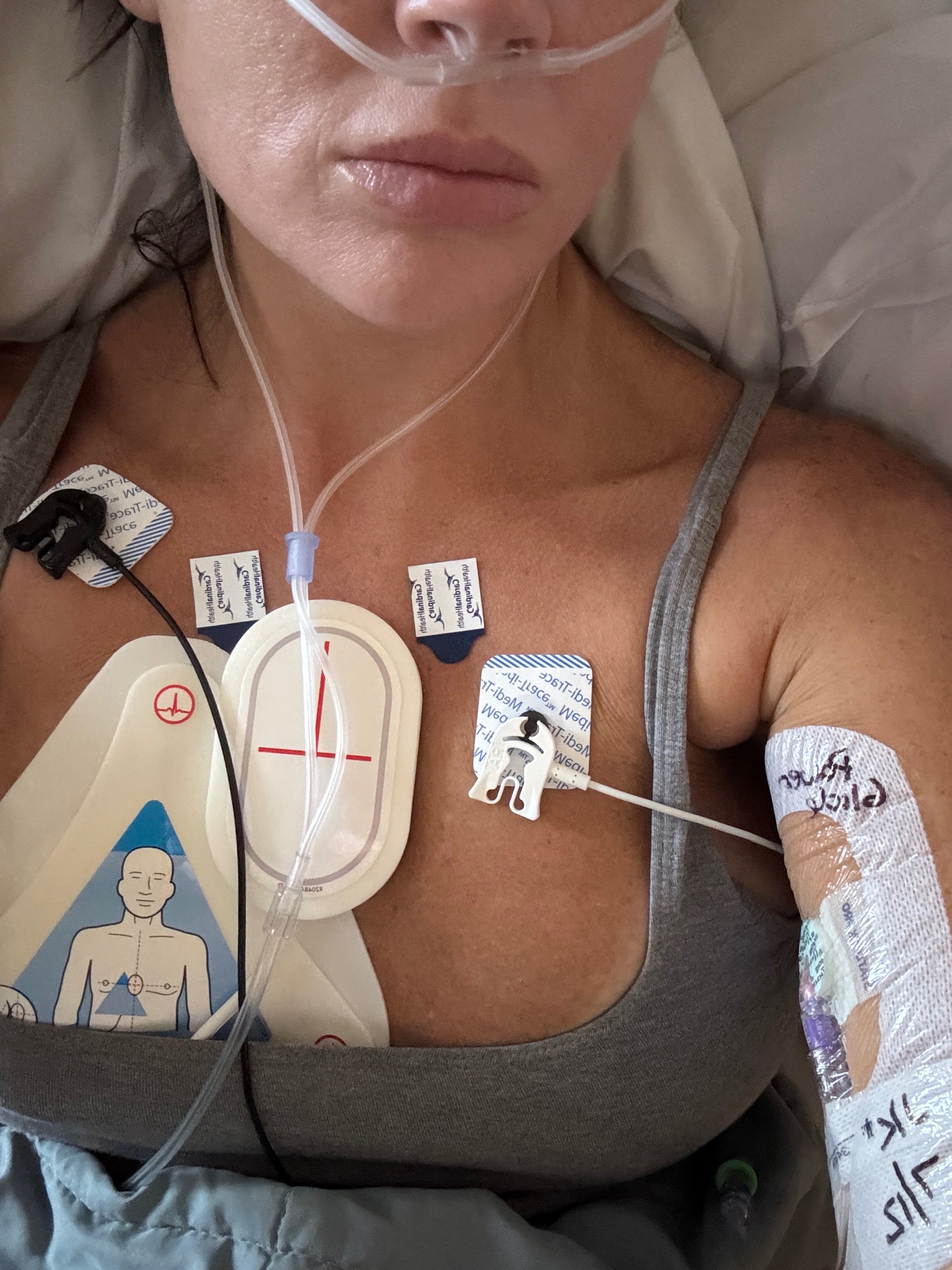 From that moment on I had 3 people in my room every hour, an alarm on my bed so I couldn’t leave it, cardiac diet, constant blood draws, pills, IV bags & vitals checked. Surgery was a must but first they had to rule everything out. I had a CT scan of my brain & heart, with & without contrast. The contrast ended up exploding in the IV & all over my hair. The vein blew & the catheter shot into my arm. An ultrasound of my heart showed scar tissue around my heart & an MRI showed no blockage which meant my heart condition is genetic. My heart was pacing between 30-40 & my blood pressure was 108