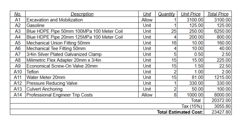 Phase III: A Water Distribution system is being designed from our captured springs leading towards 15 residential houses in the Maca Grande community. The NJIT Ecuador Project team has been working on the implementation plans for this project since 2024 and have not been able to raise the sufficient funds to complete the implementation. Our original cost estimate $30,000 for the pipe network materials and implementation. Our current cost estimate for materials alone is about $25,000 and most of our labor costs are cut because the members of the Maca Grande community will be working on the implementation themselves, providing labor free of charge. Our detailed cost estimate is shown below.