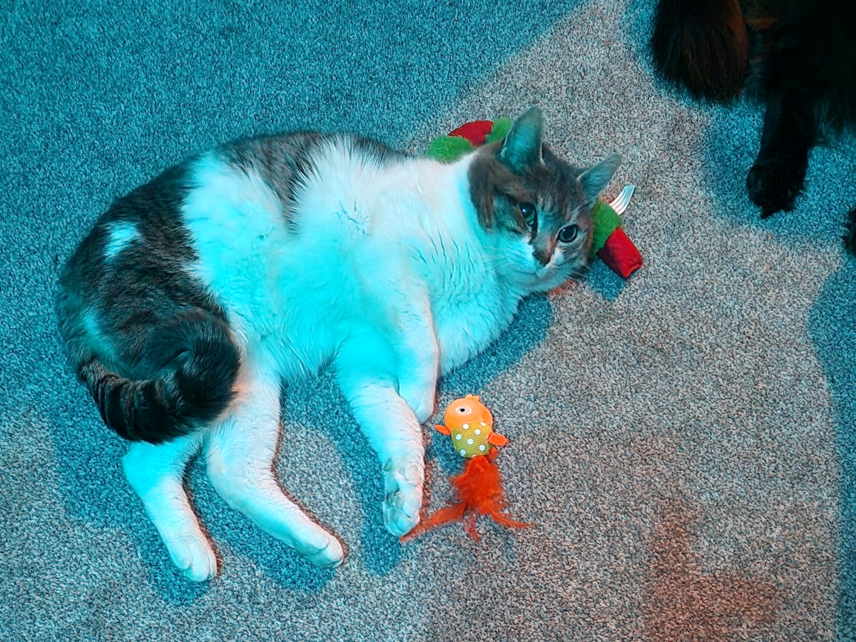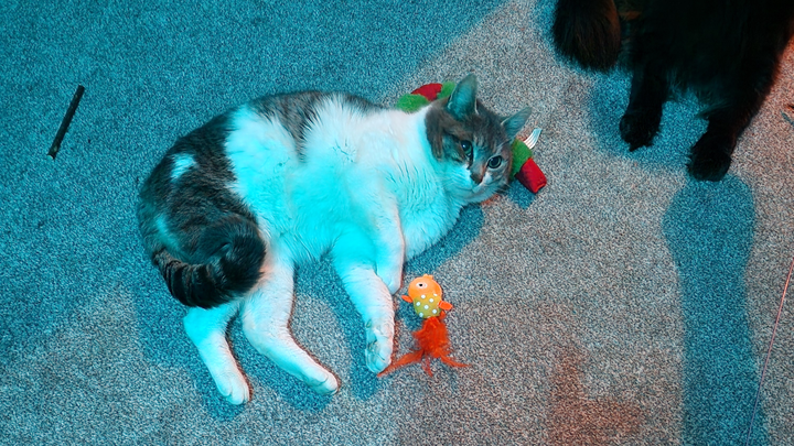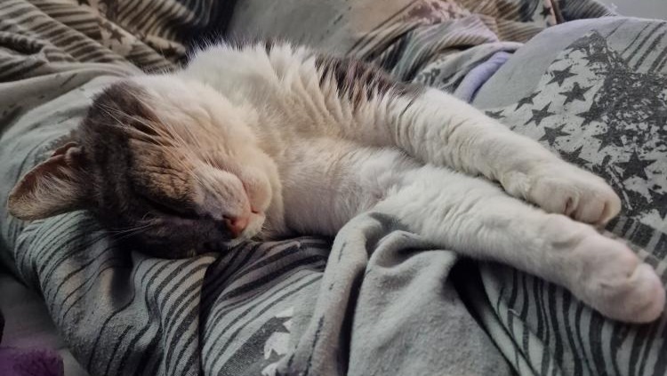 My partner Josh and I meet Odin as a stray kitty in cold January 2025, it was very cold, snowy, and there was Odin meowing his heart out like he was asking for help. He was quite feral and wouldn't let us approach him but he did accept treats and food - from a distance. We started leaving him food and water in a shed where We made him little warm bed. The temperatures continued to plummet and we saw the water we left him freeze over one morning, fearing for Odin's wellbeing we decided to catch him and adopt him.