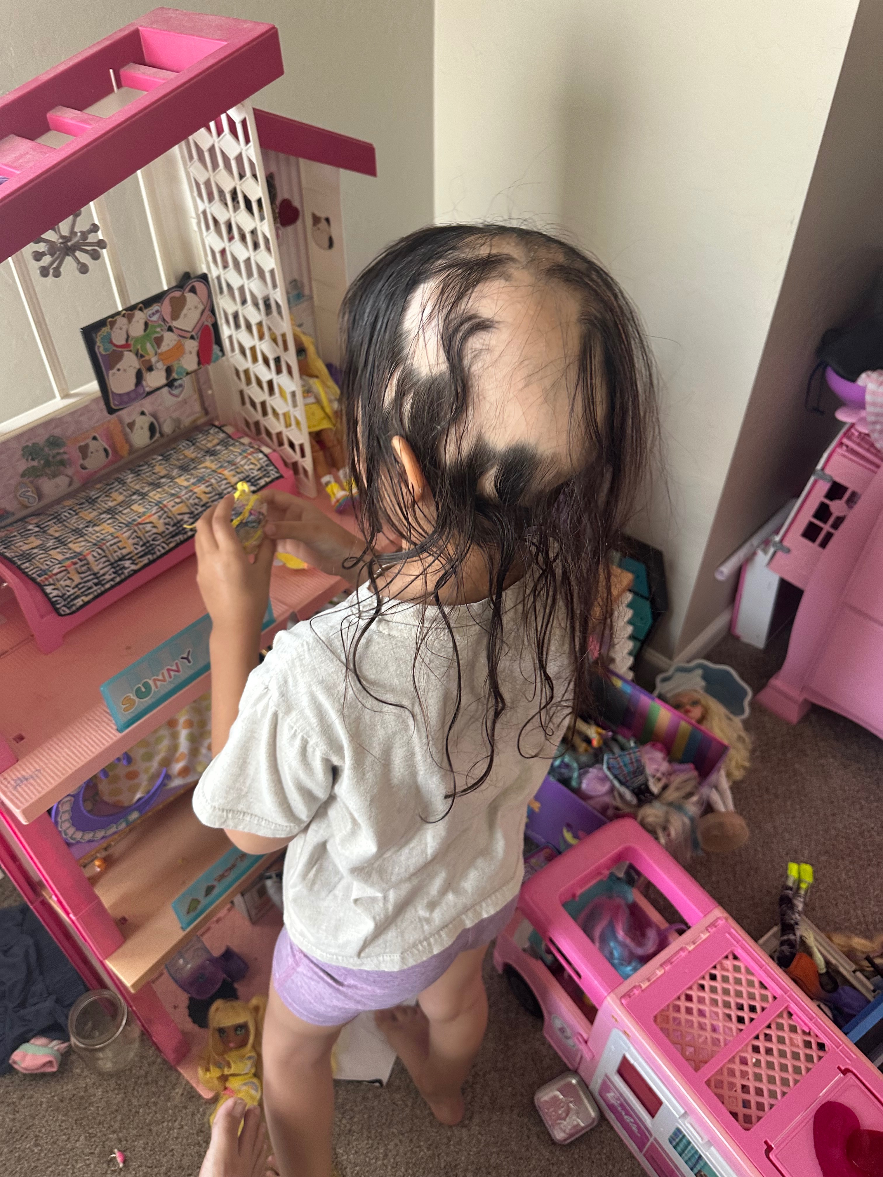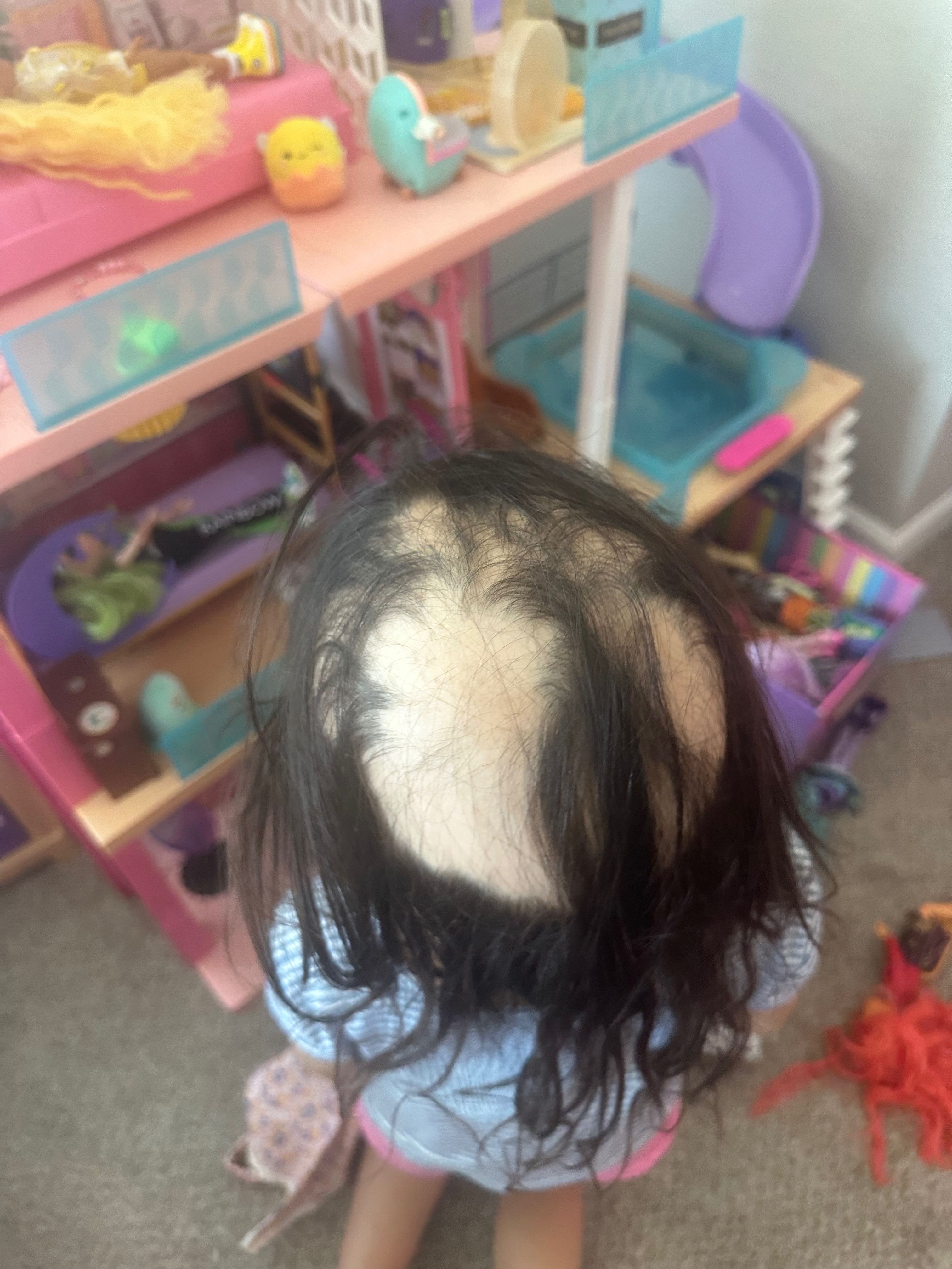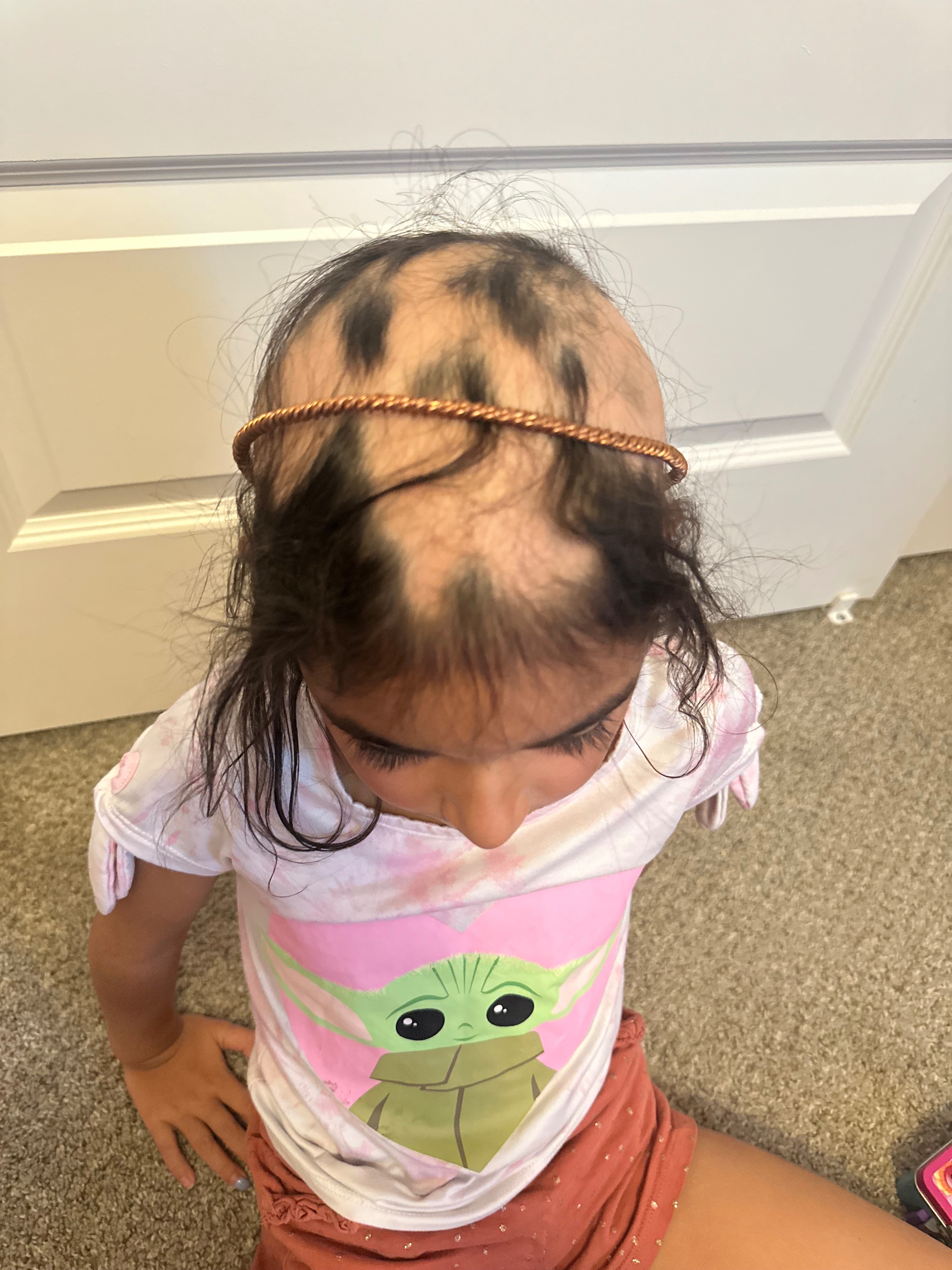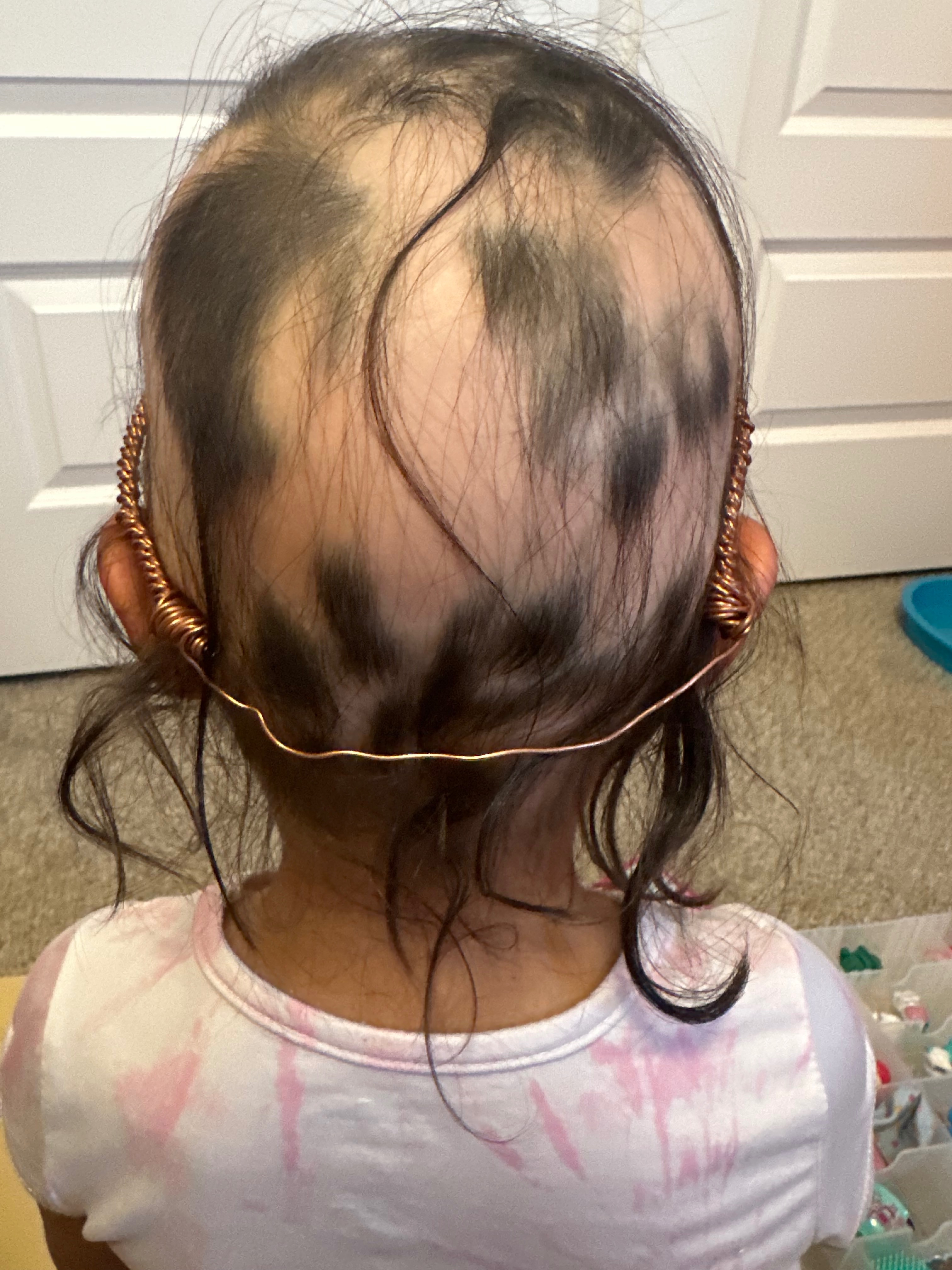Olive has been diagnosed with Alopecia Areata, an autoimmune condition where the immune system mistakenly attacks hair follicles, causing hair loss. What began as a few small bald patches quickly progressed to more extensive hair loss. For a child so young, the emotional toll for her and Raymond and I has been heartbreaking. This is a very complicated condition as the factors that contribute to symptoms are many and they are different from person to person. It’s a very individualistic disorder and no two cases are the same. We are fighting to find the root of the cause and not just accept the hair loss. She is too young for a lot of recommend hair growth prescriptions that can be prescribed by the dermatologist. Olive’s pediatric dermatologist didn’t recommend any of the medications because of side effects of unwanted hair growth in places she shouldn’t have hair.