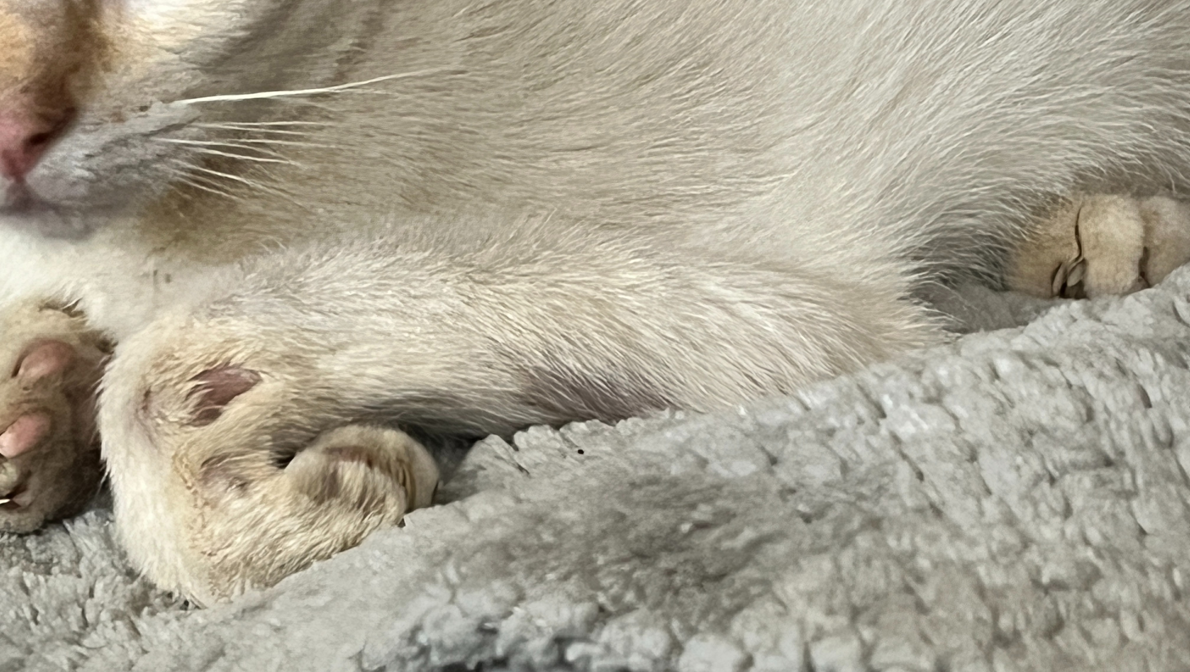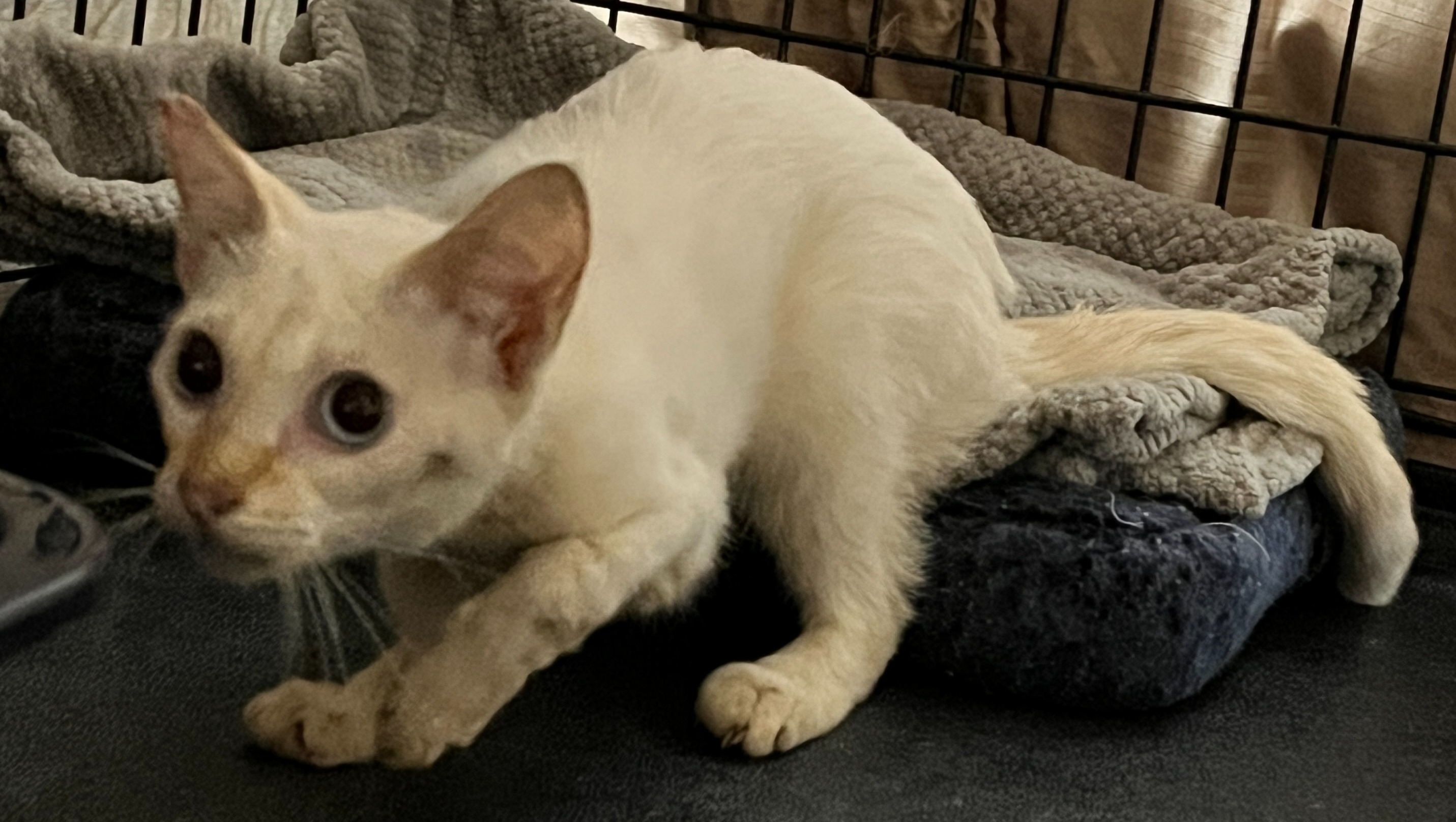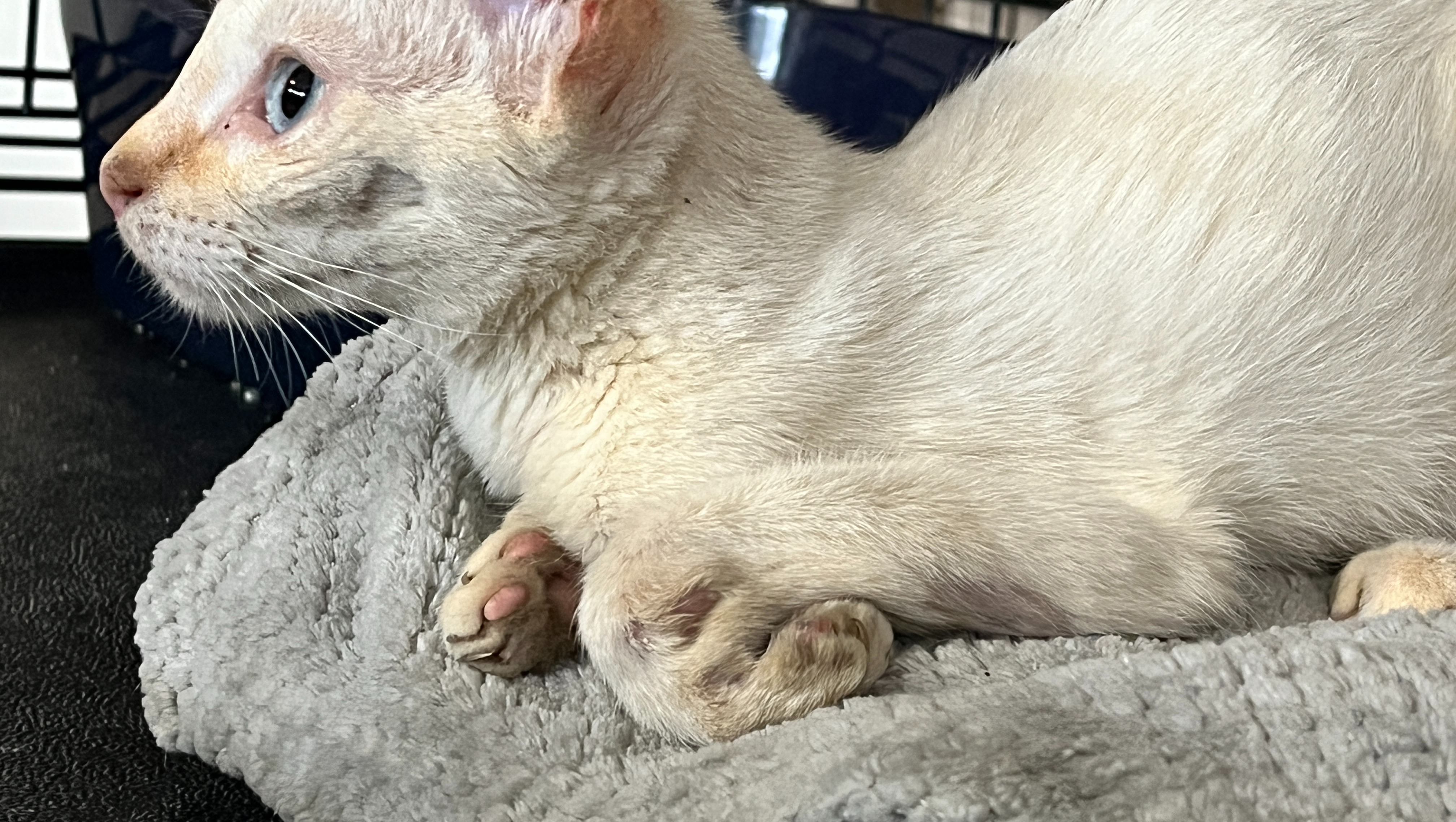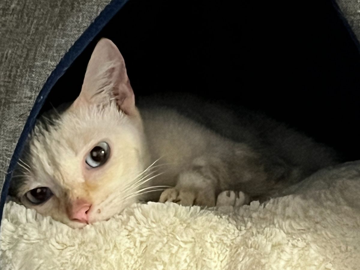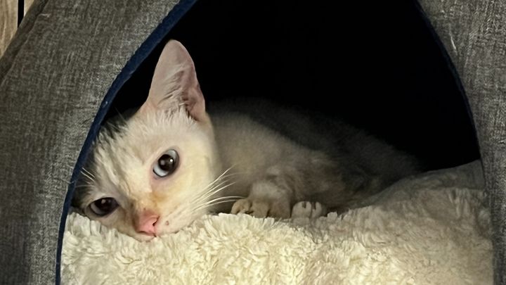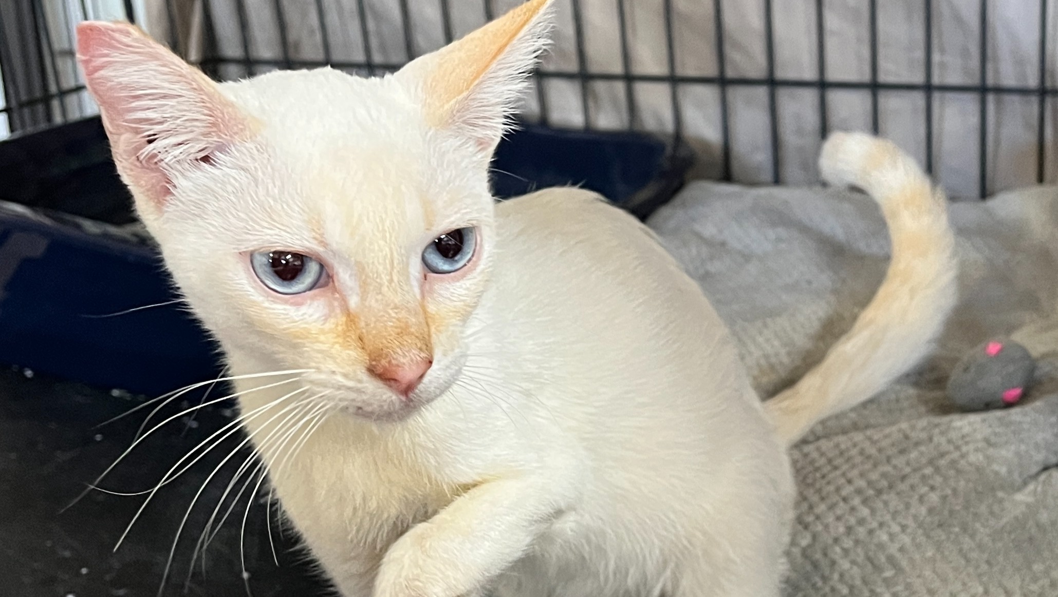 Here are additional photos. Annie and her brother Apollo are both FlamePoint Siamese (white with orange on the tail, nose and eartips) and have blue eyes.