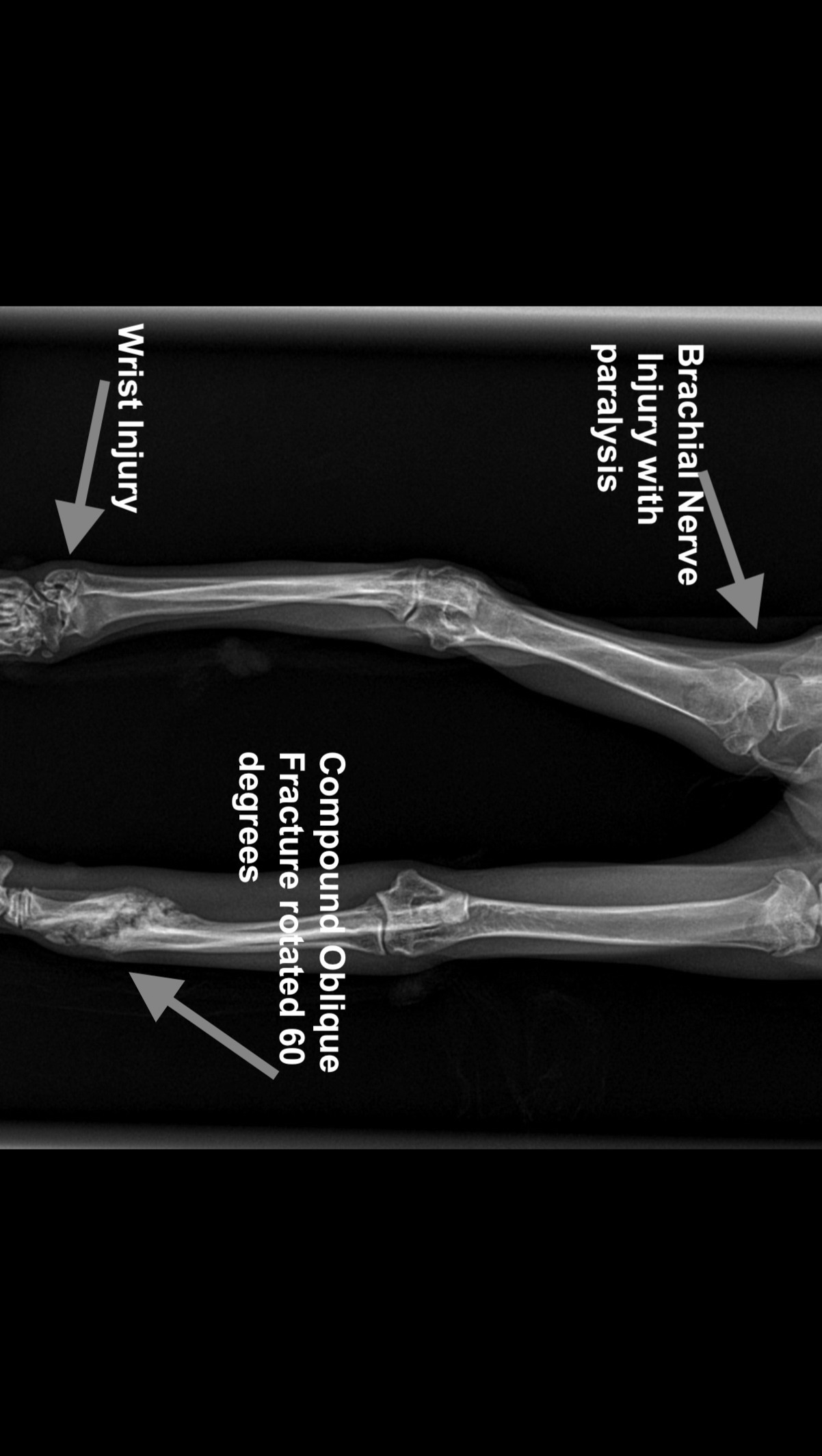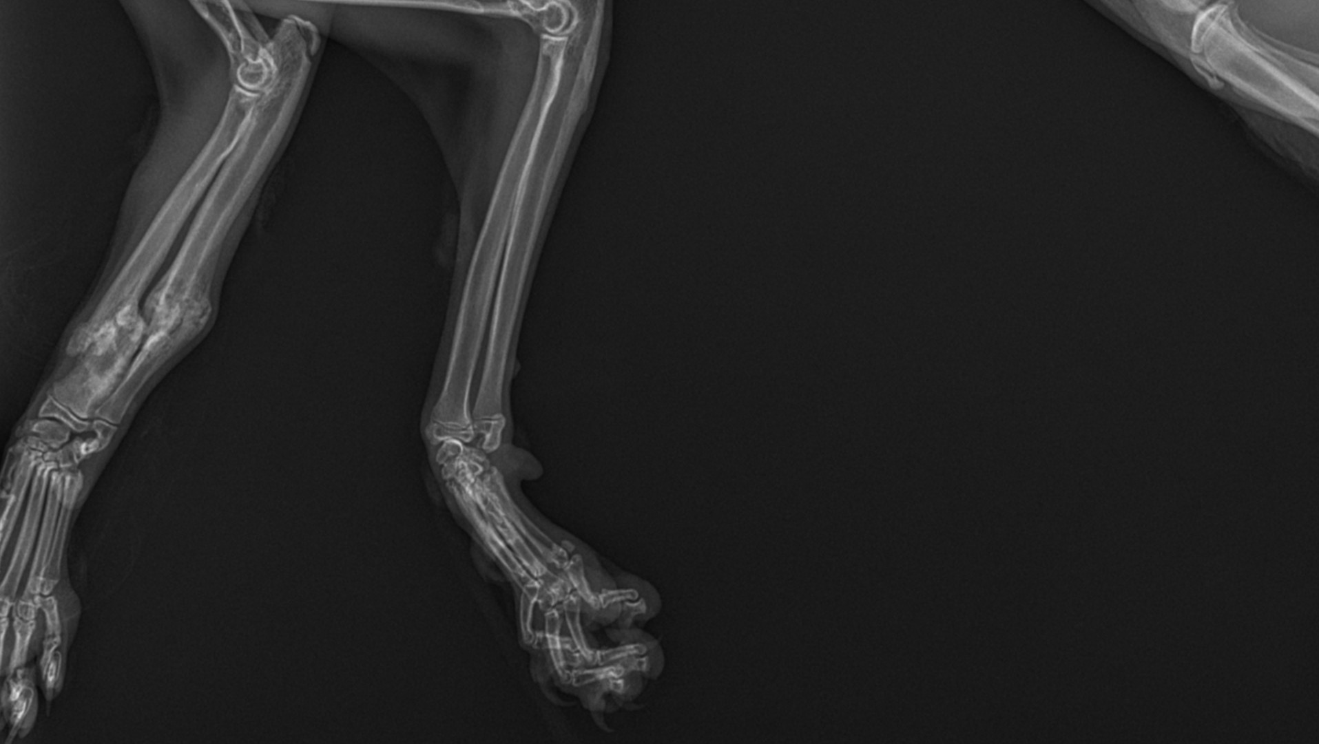 We rushed her immediately to an emergency veterinary clinic, where she weighed 3.9 lbs., about half what an eight-month-old kitten should weigh. The exam found multiple wounds from head to tail, her left leg was extremely atrophied and paralyzed with likely radial nerve damage, her left elbow was raw from pulling herself along with it, and her left wrist was also injured. X-rays showed the biggest surprise though... her "good" leg, the right front, had broken radius and ulna bones (a compound oblique fracture) from about 6 weeks prior, which had rotated 60 degrees and is healing out of alignment. It was clear that Annie had suffered traumatic injuries consistent with being hit by a car, and it happened within days of escaping more than six weeks prior.