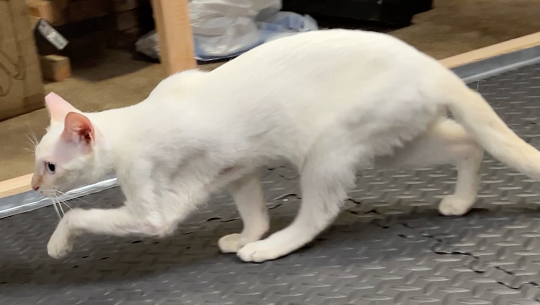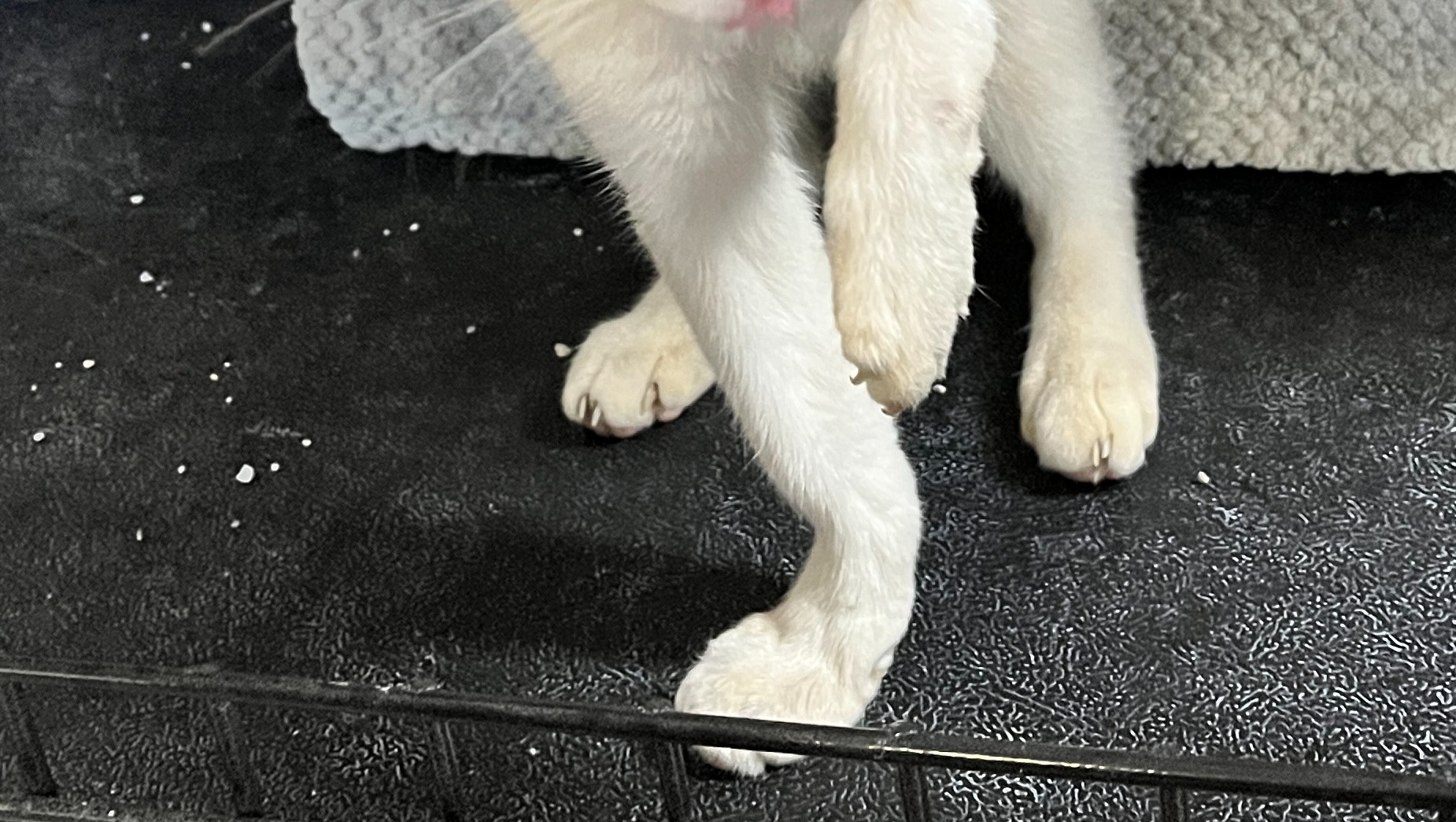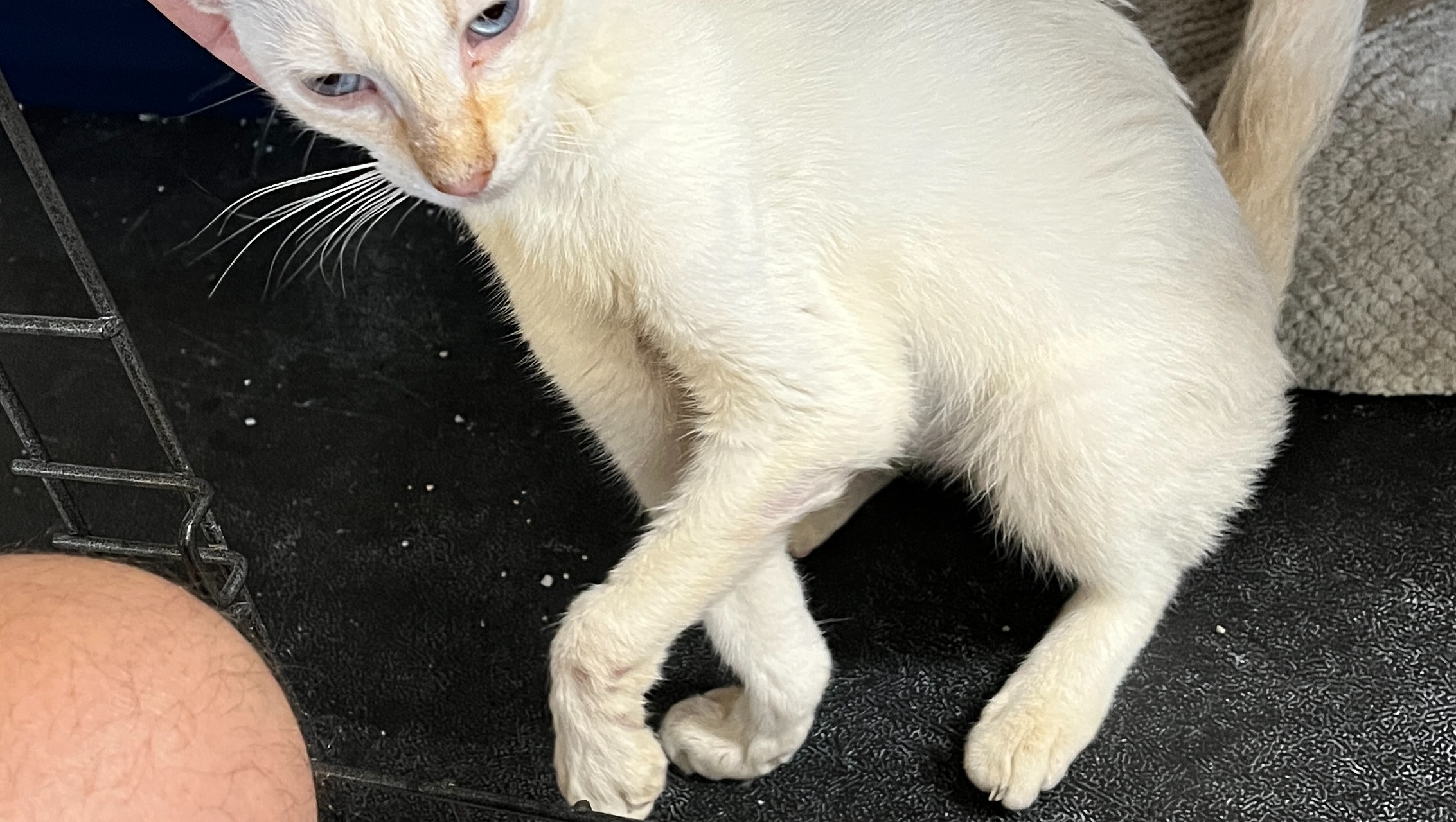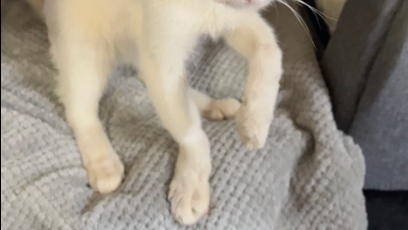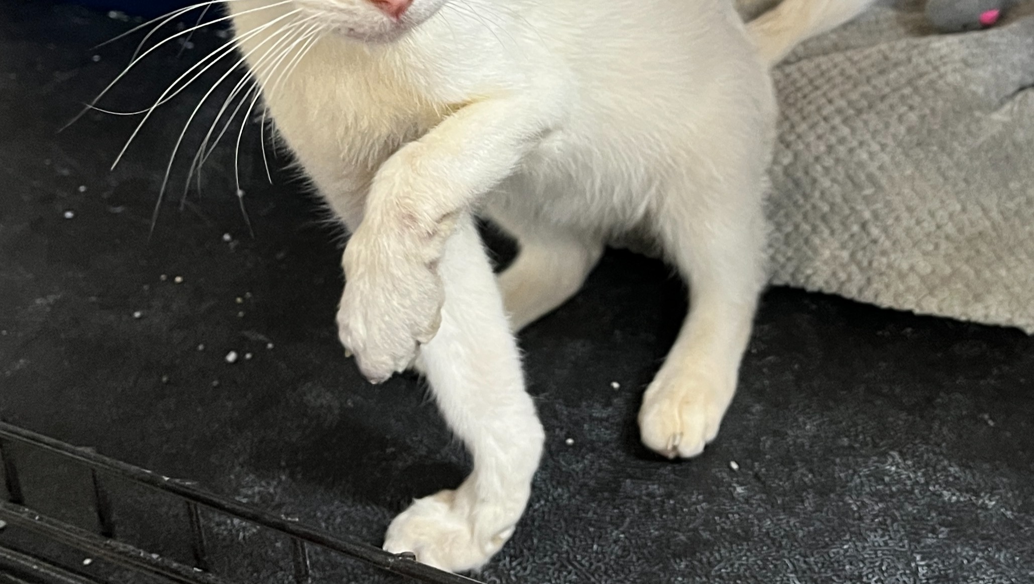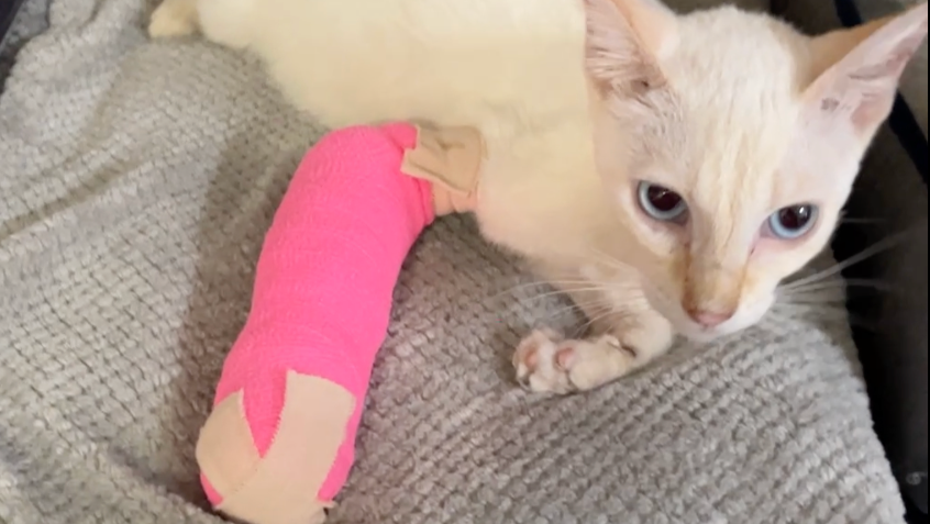This explained why her left elbow was scraped raw, and why she was so skinny: for six weeks her right front leg was broken and her left front leg was basically paralyzed from the elbow down, so the only way that this poor kitten could move around to find food was to drag herself using her left elbow. We have no idea how Annie was able to find food or even protect herself from feral cats and any other threats with no working front legs for six weeks. A few days later the labs came back that she also had the Giardia parasite, probably exposed at the same time as Apollo before she escaped, and she also had Hookworm.