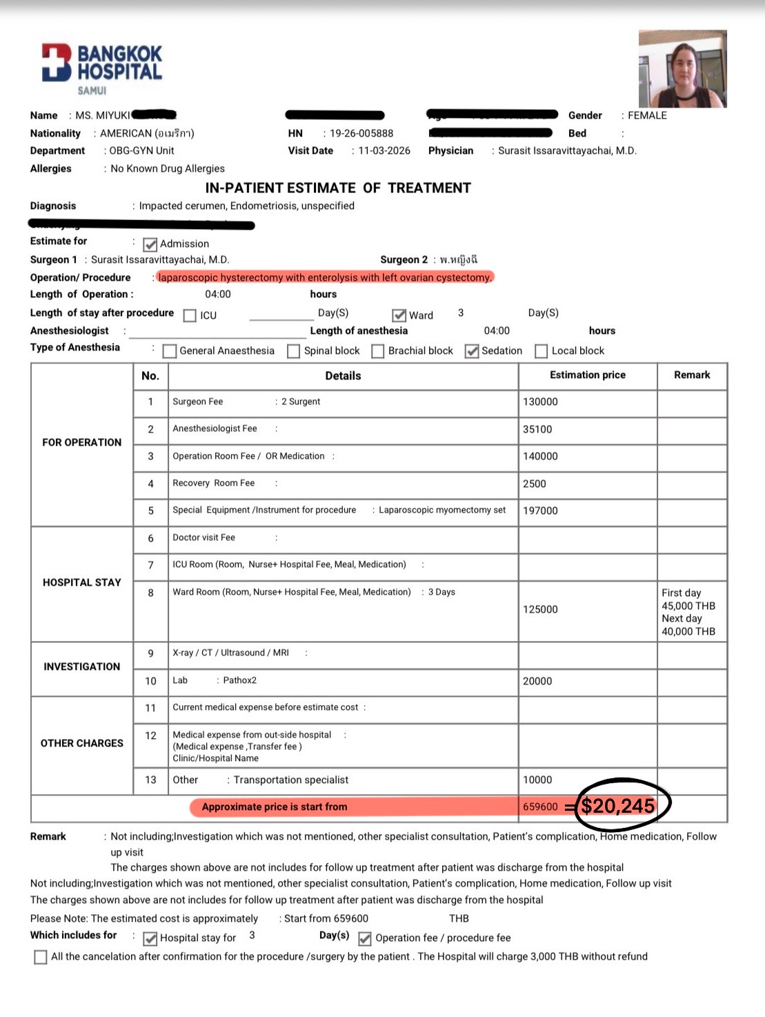 - $15,000 for the hysterectomy, endometriosis excision surgery and post-op medications.
